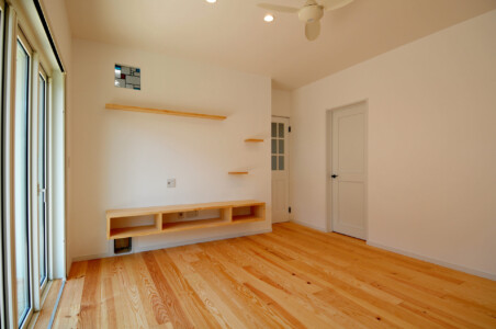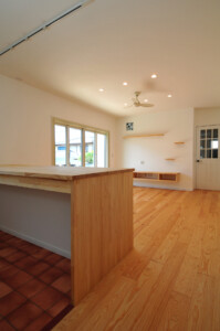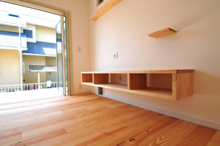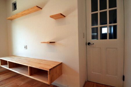 洗濯物が干せる広い洗面所や造作のキッチン作業台・書斎カウンターにテレビ台、本棚。