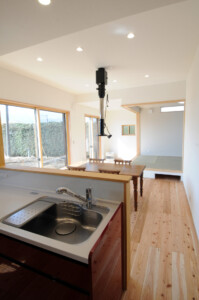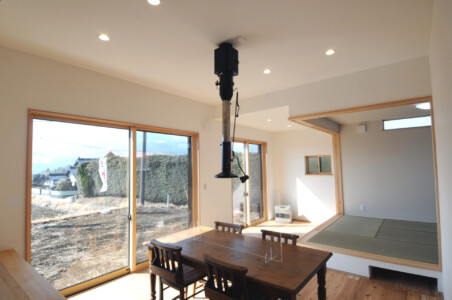 70代夫婦が暮らすのに十分な広さの平屋2LDK。念願の阿蘇の景色を十分に堪能できるよう、小上がりの和室には大きな窓。