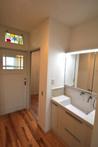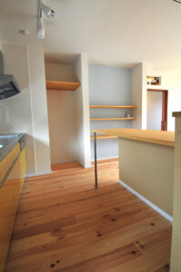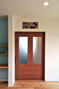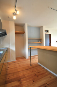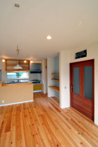 床材には21mm厚のパイン材などの無垢材を使用しナチュラル素材をベースに、広めの廊下ワイドタイプの1.3m幅の引き戸、また所々に和のデザインを入れることでゆったりとした落ち着きのあるお家です。