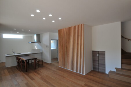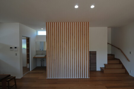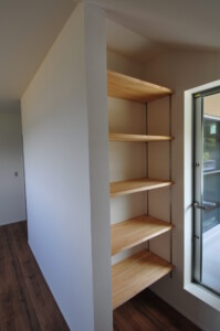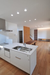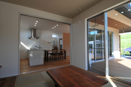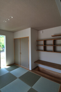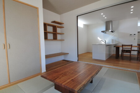掘りコタツ式のパソコンコーナー・屋根裏を利用した収納・フルオープンできる引込建具の和室・無垢材でデザインした壁・夏冬の衣替えがいらないクローゼット等々実際の生活習慣を細部まで考えたお家です。