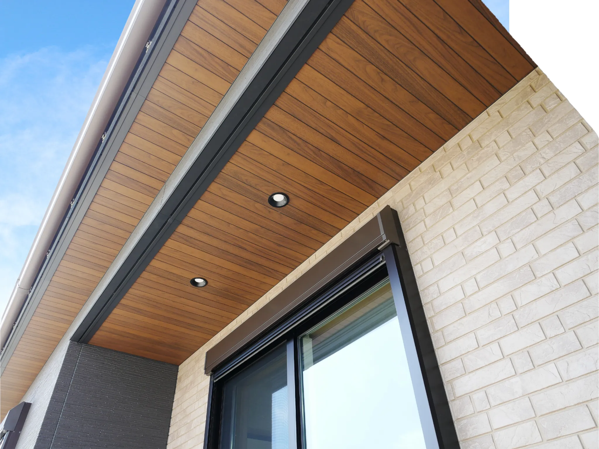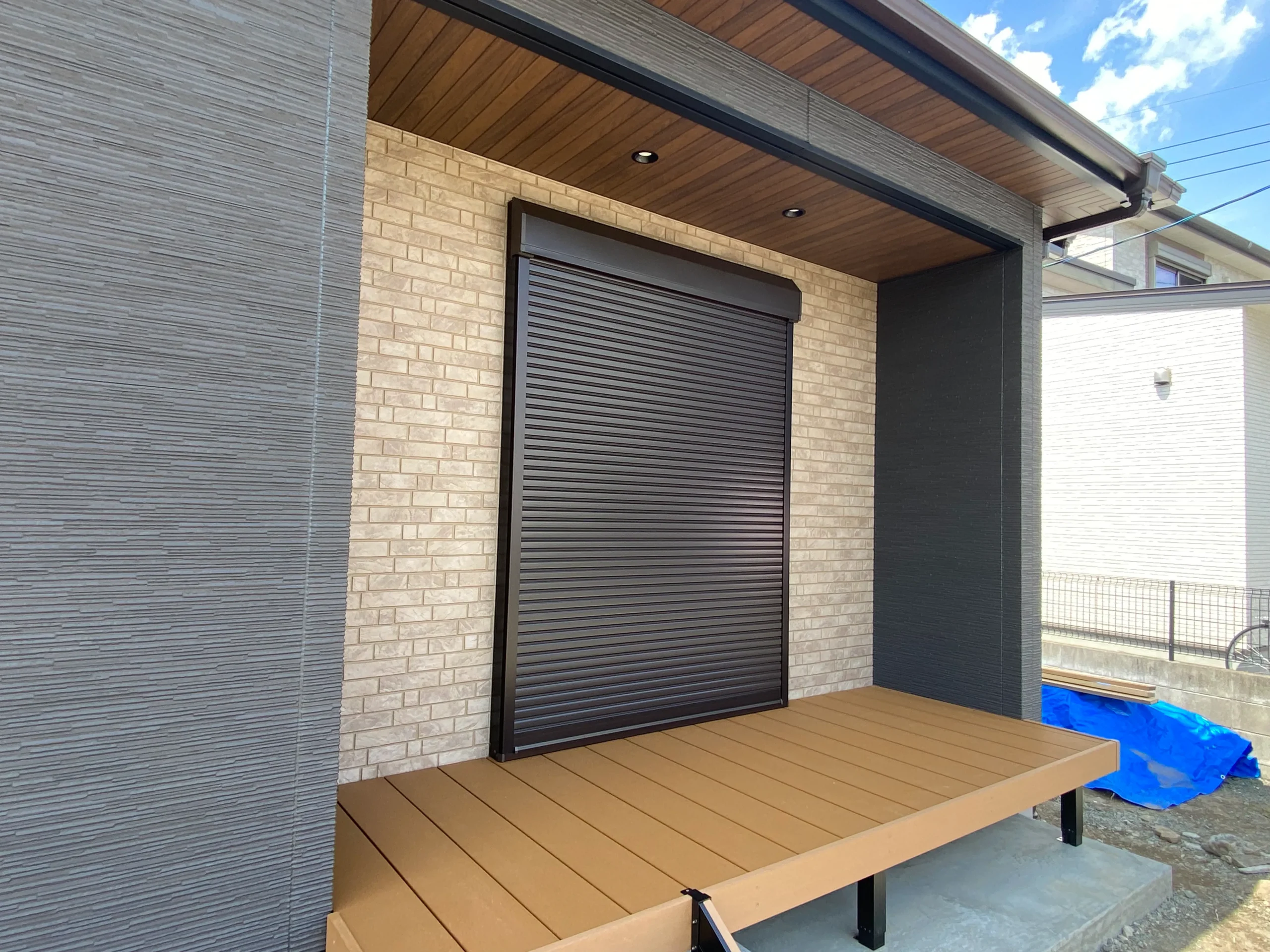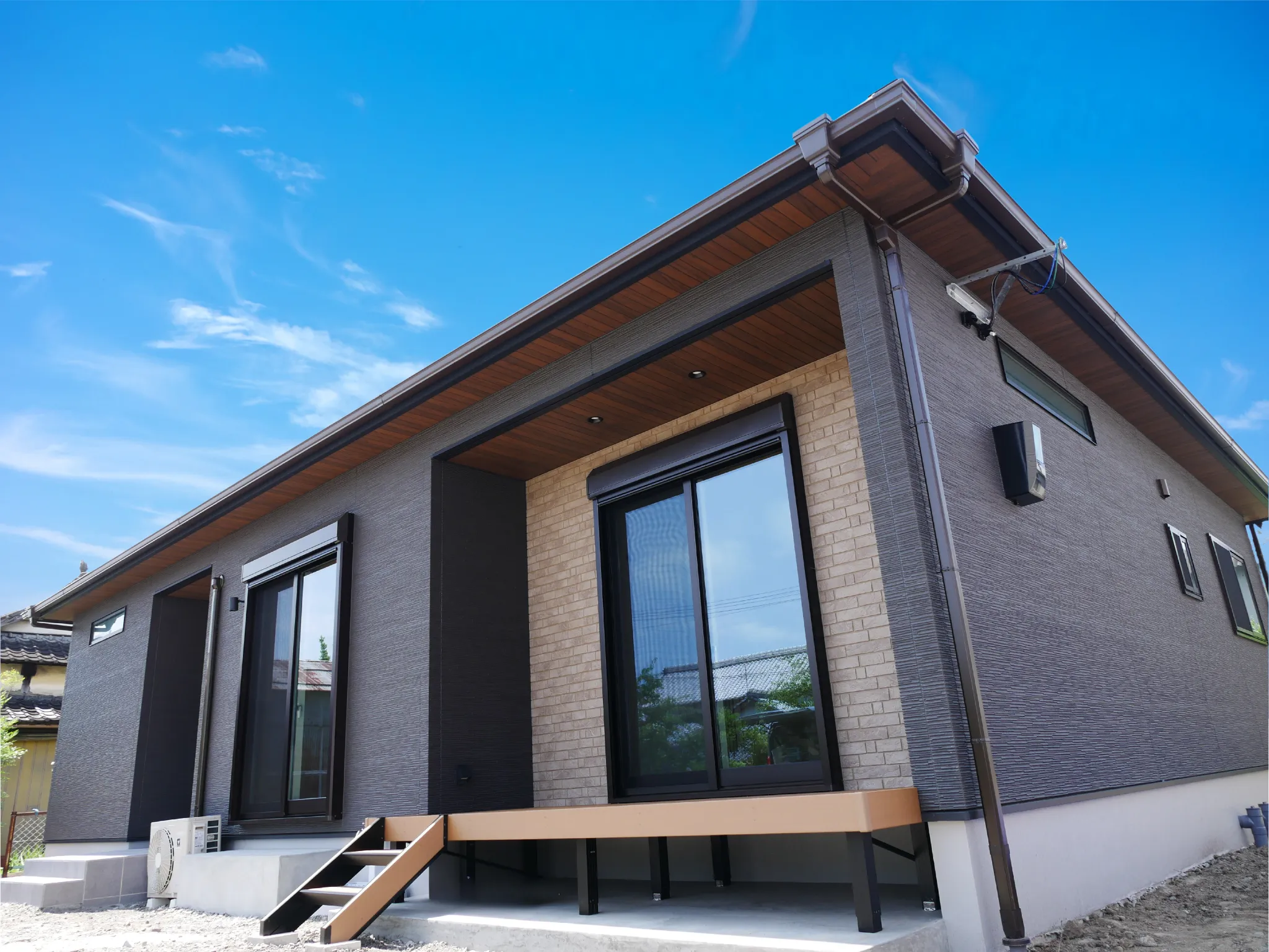 外観は、和モダンのスタイリッシュな外観デザインで、屋根の軒が深く、様々なシーンで活躍しそうなウッドデッキも配置。
