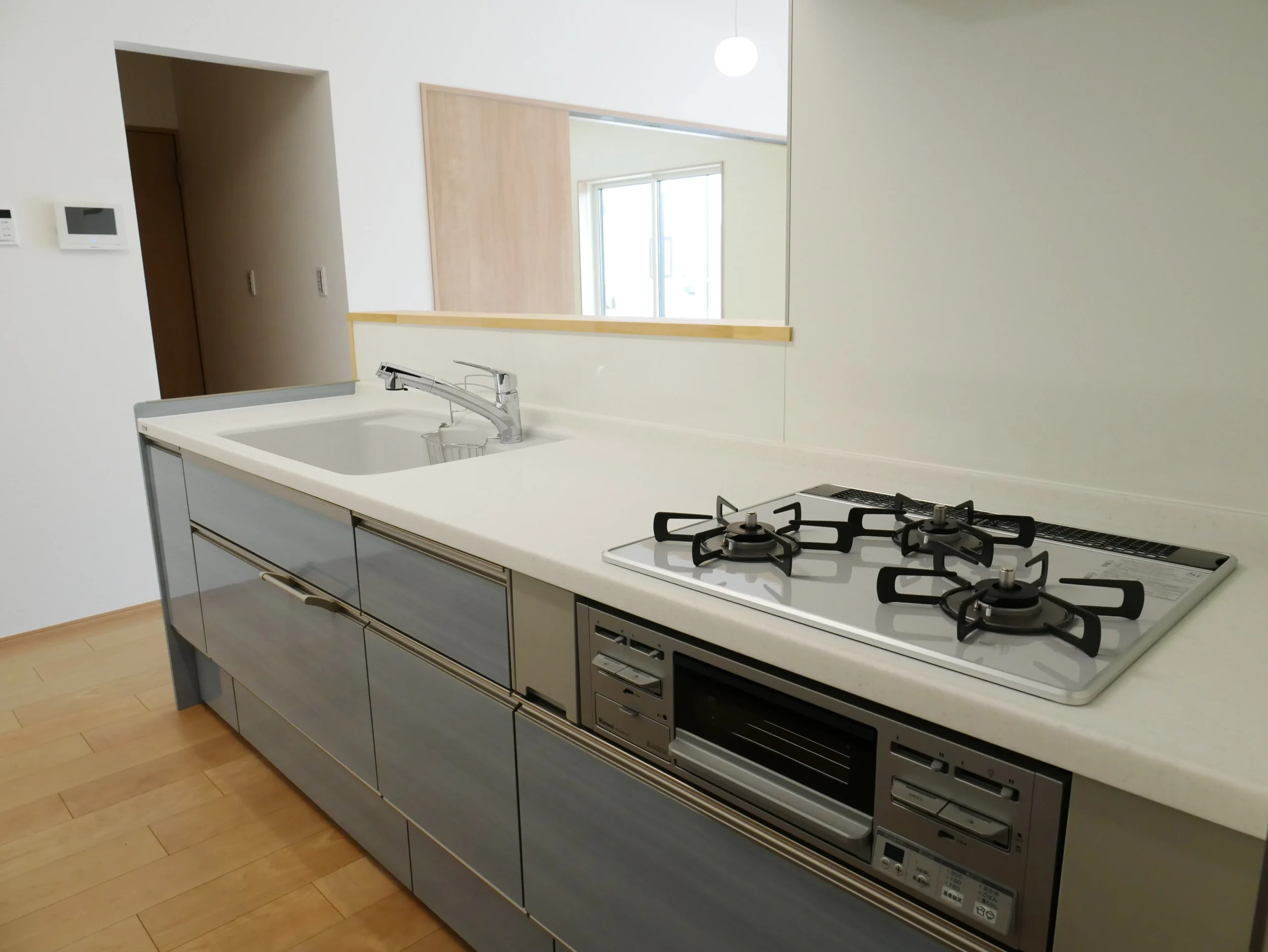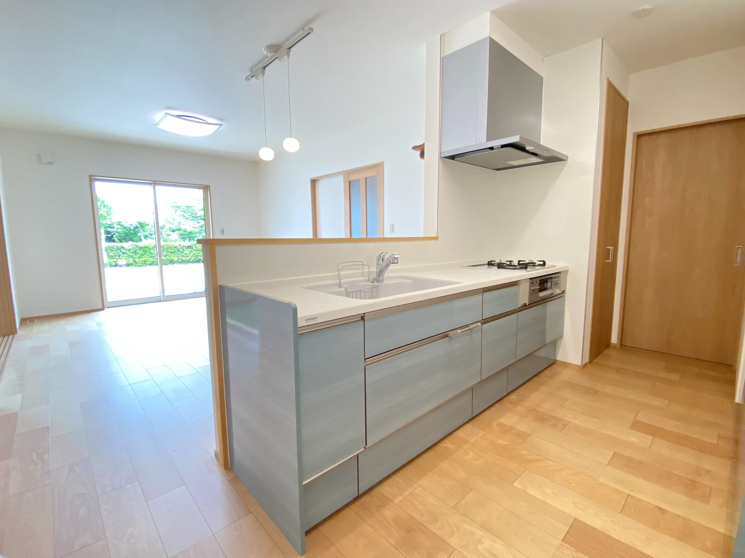 洗面やバスルームにも移動しやすい回遊性のあるキッチン。