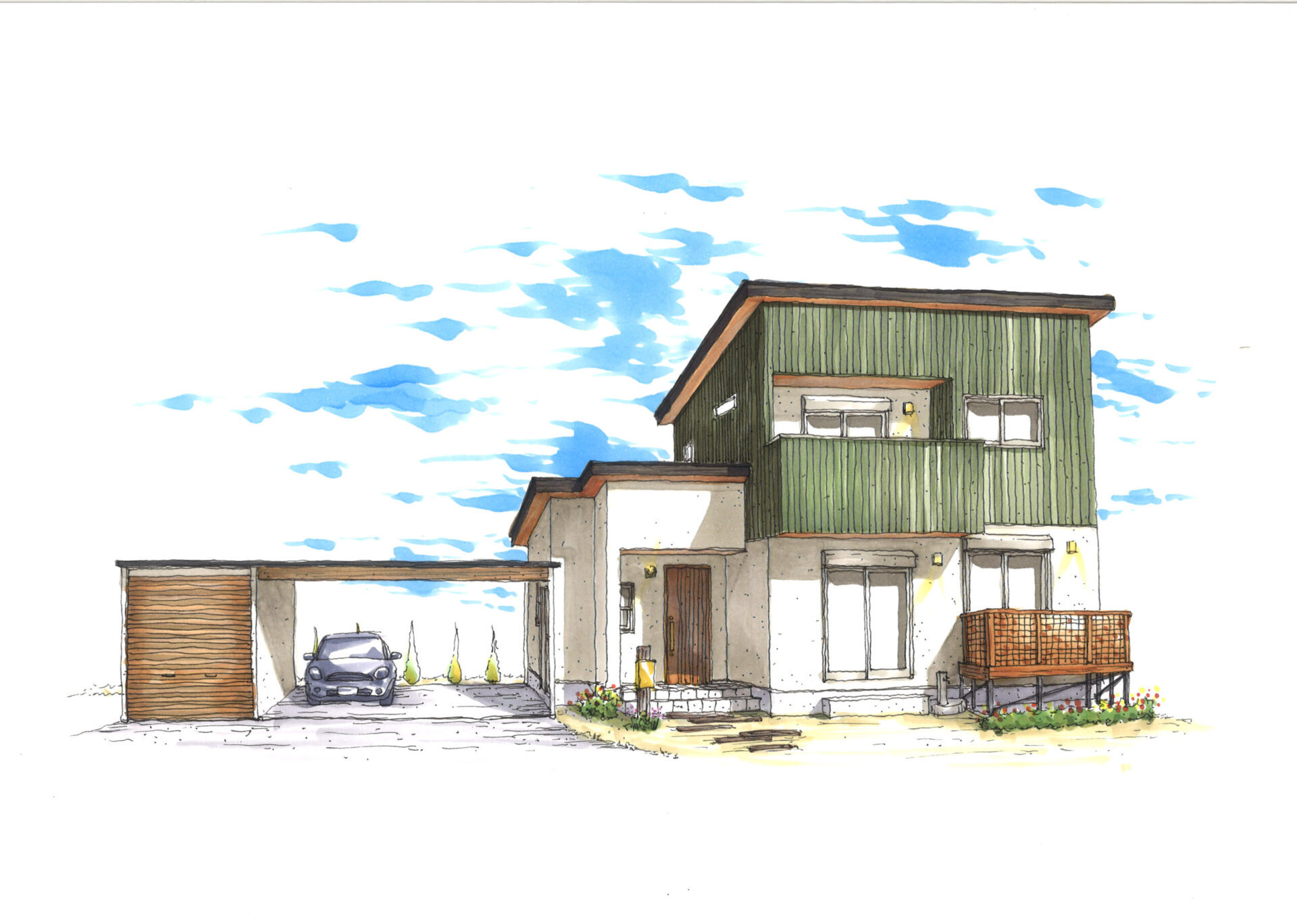 ナチュラルで見た目もおしゃれな雰囲気。お子さんが増えたときに変更可能な寝室や、書斎・倉庫など、将来を考え、家族の希望をたくさん詰め込んだ2階建てのお家です。
