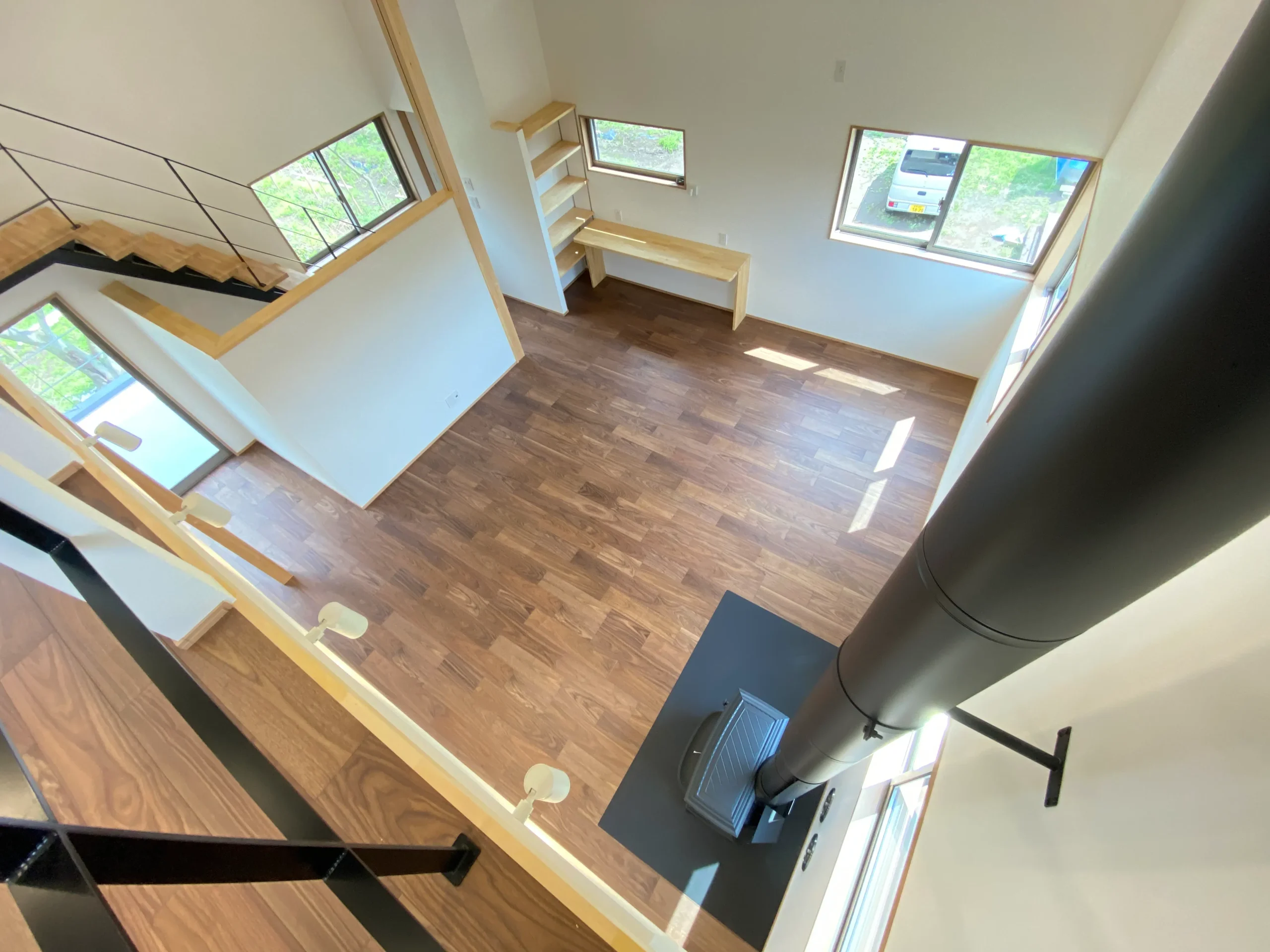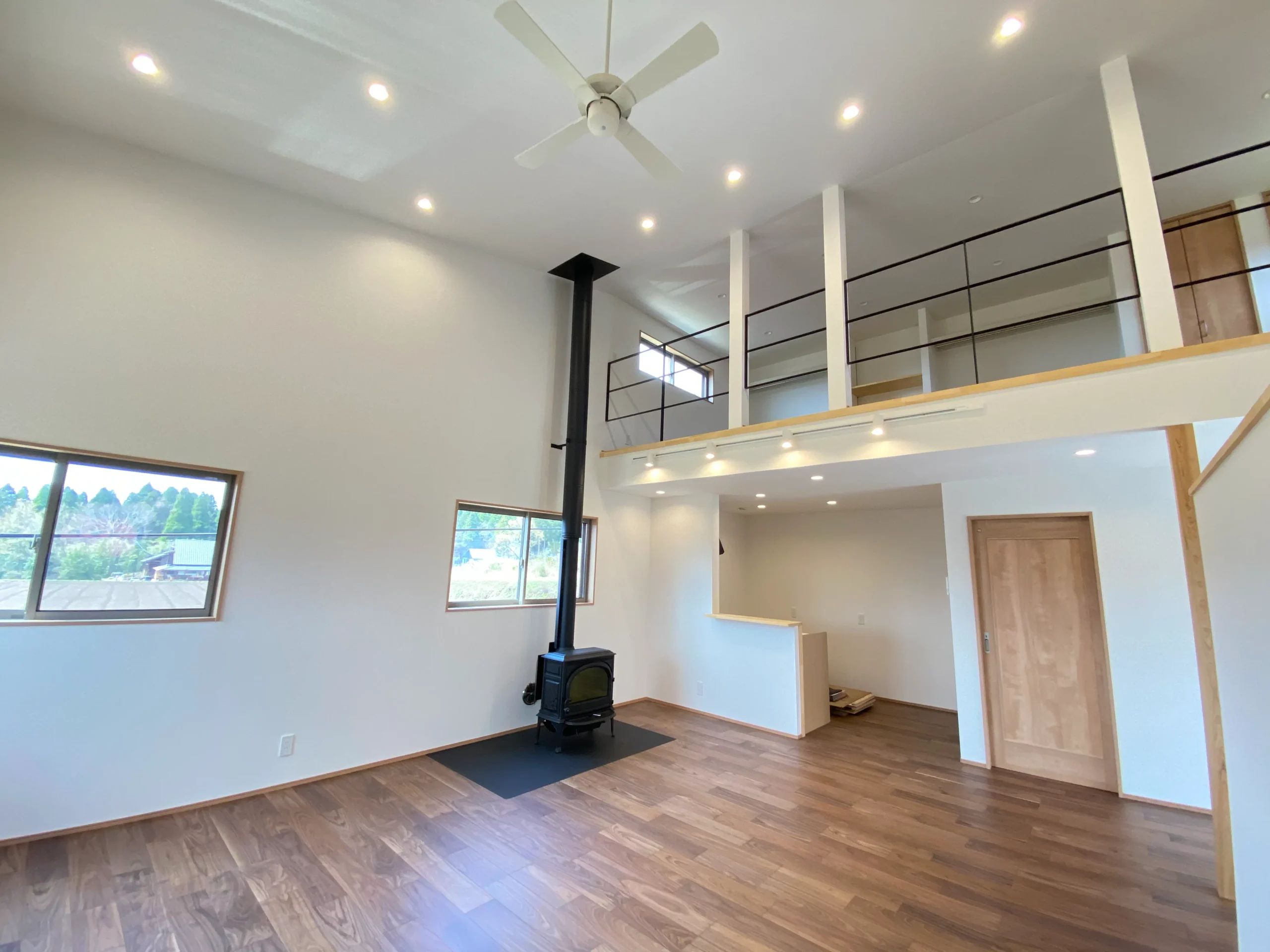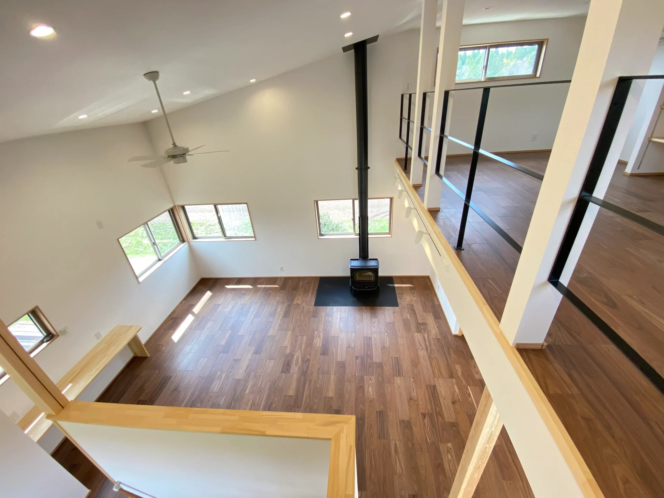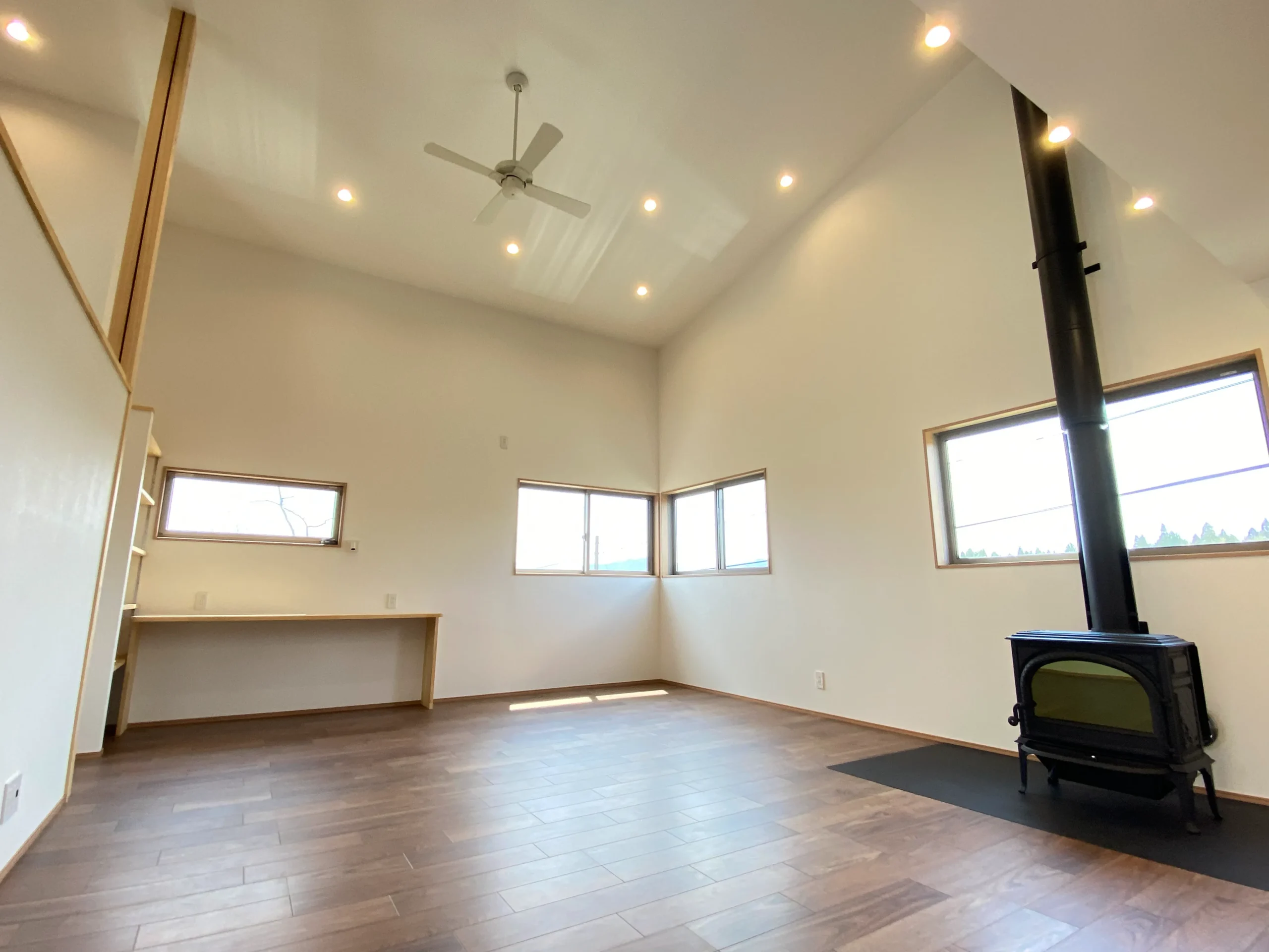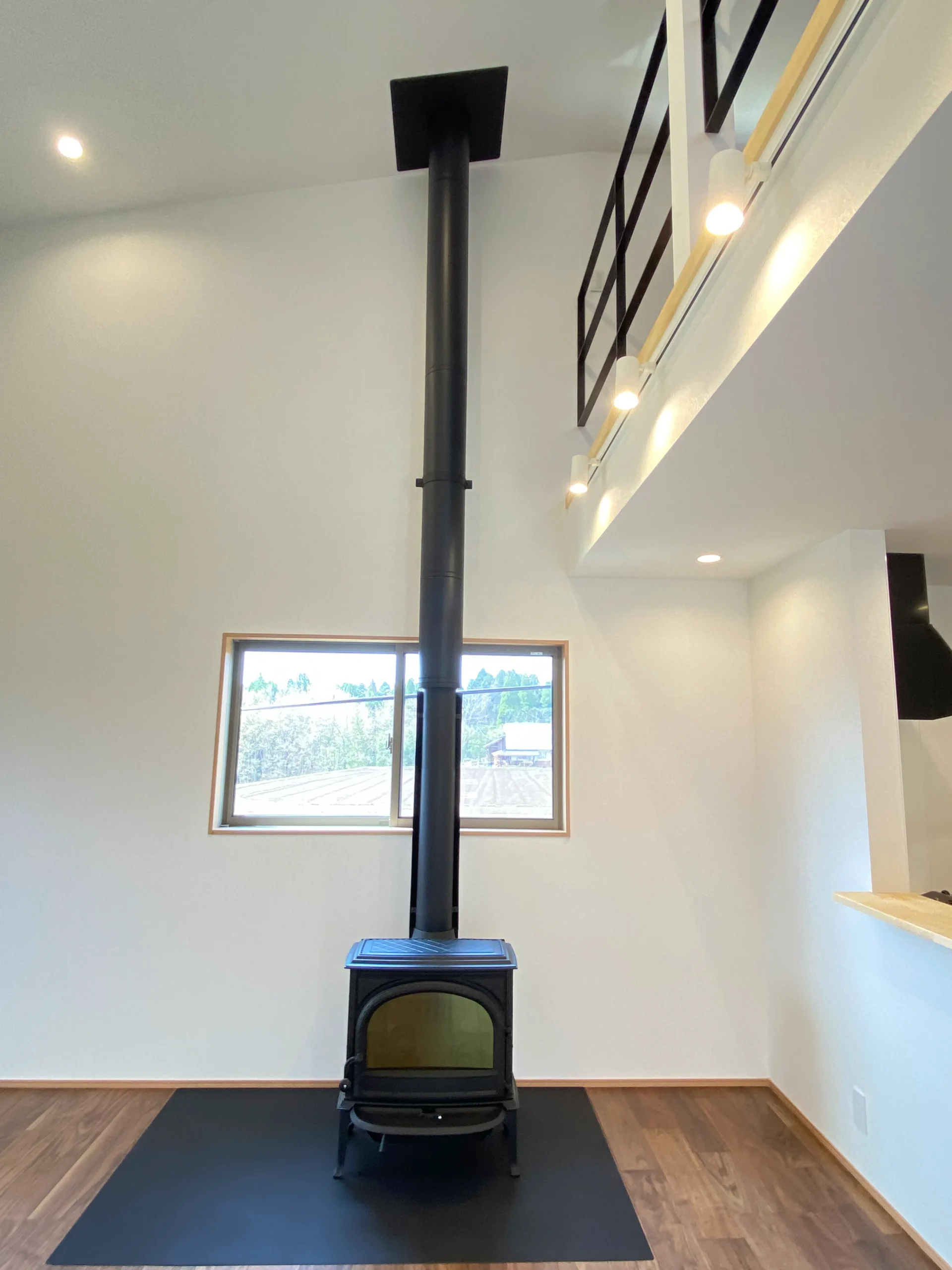 リビングの開放的な吹抜けと薪ストーブのあるお家です。