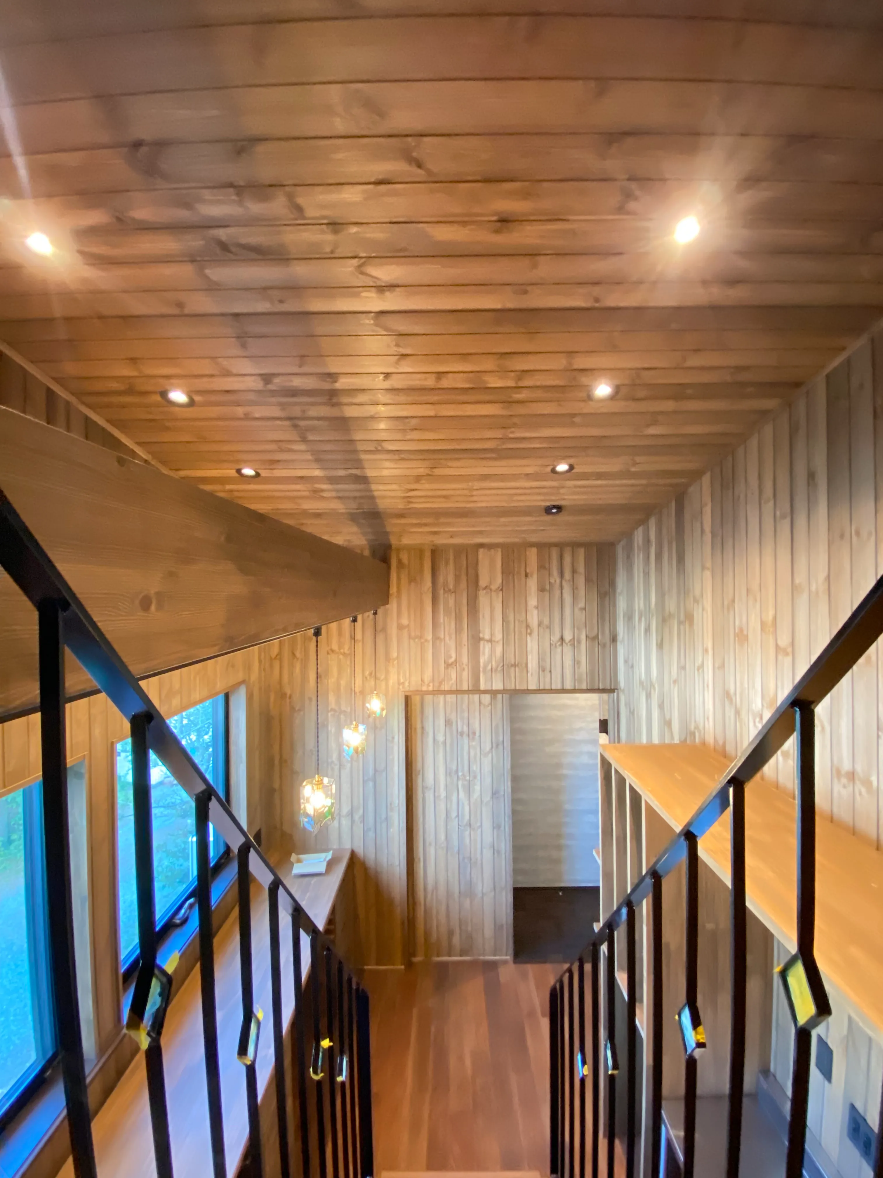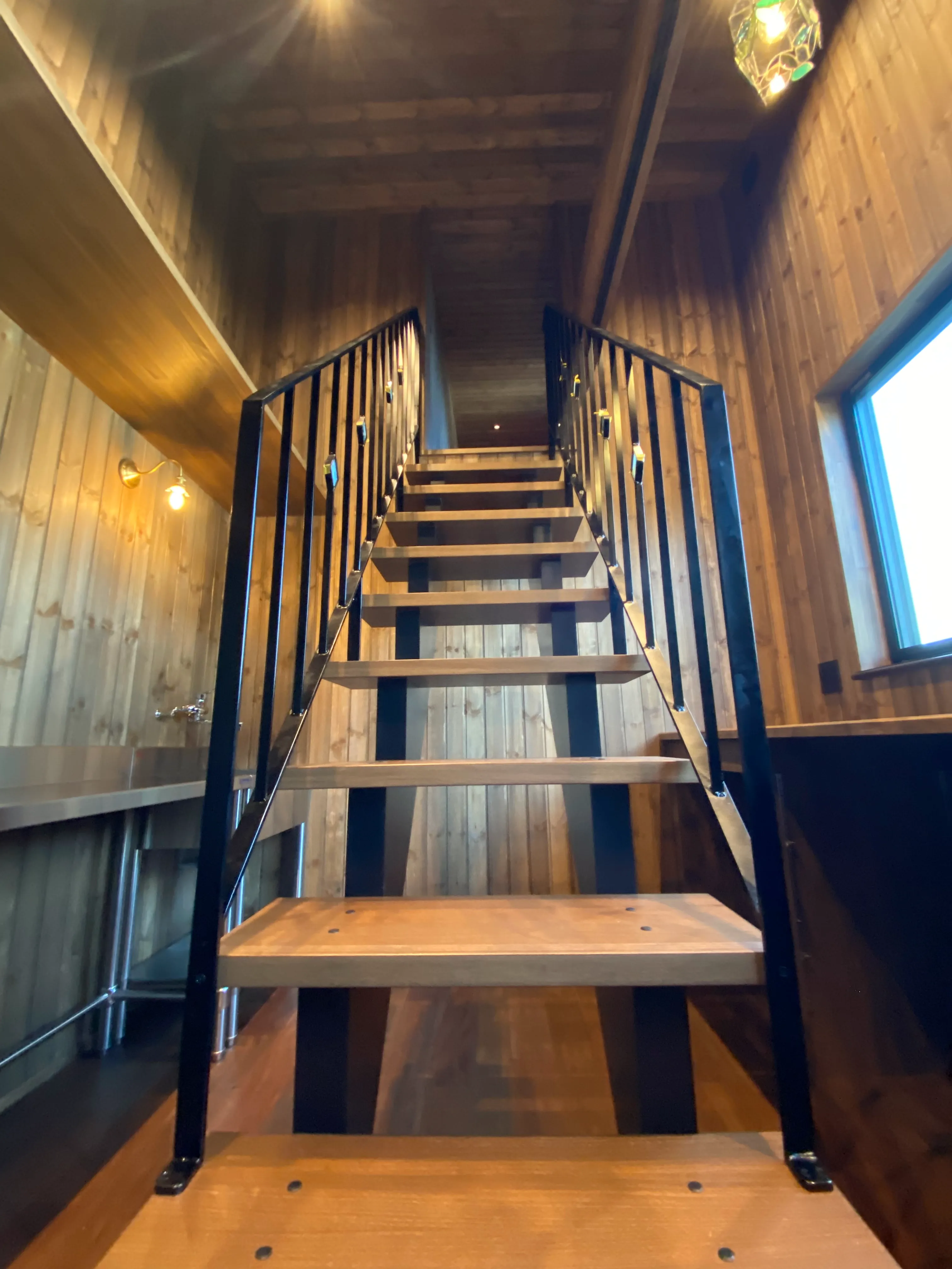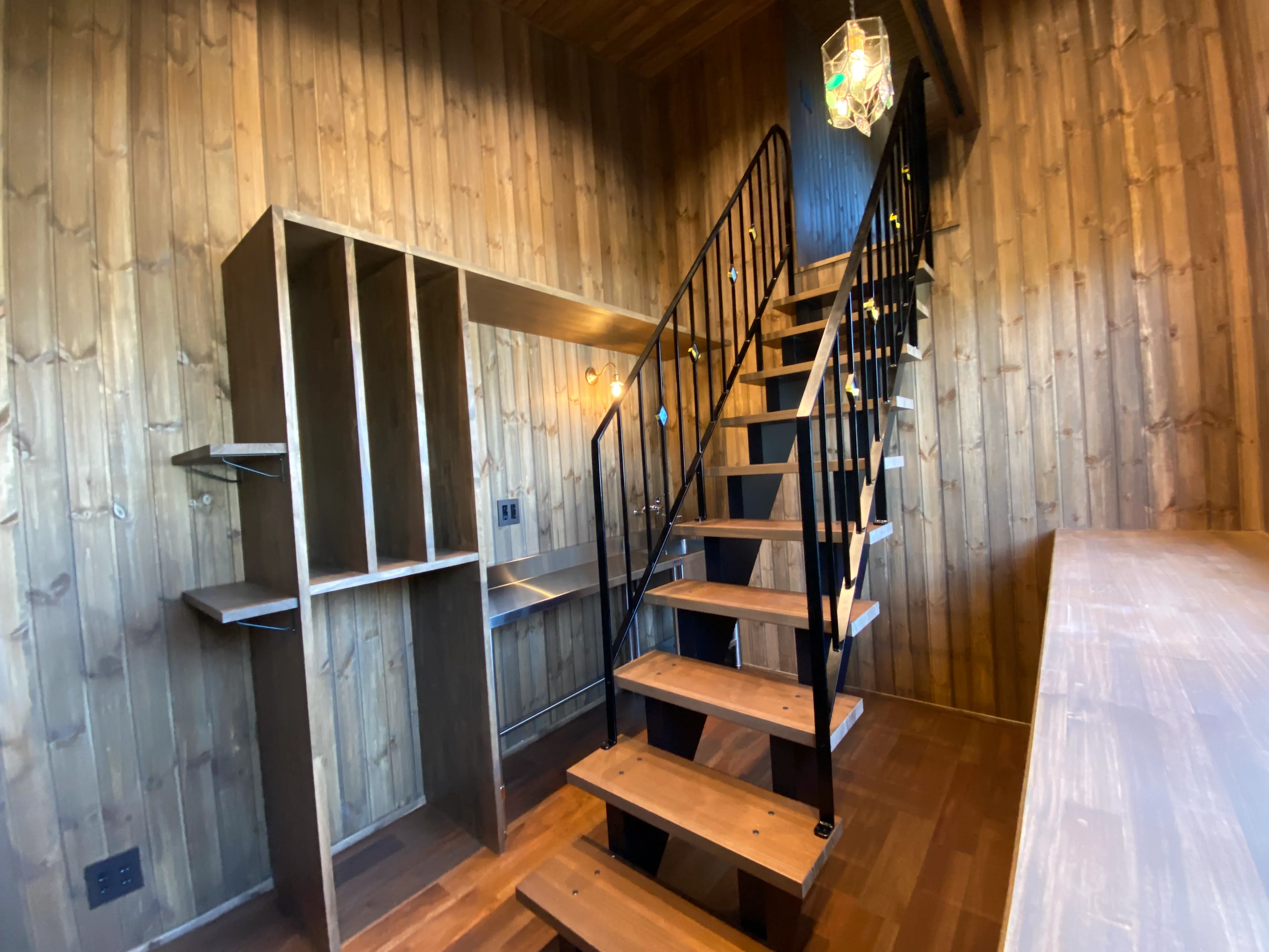 アイアン手すりの階段を上ると、ベッド付きプライベート空間の4帖ロフトがあります。