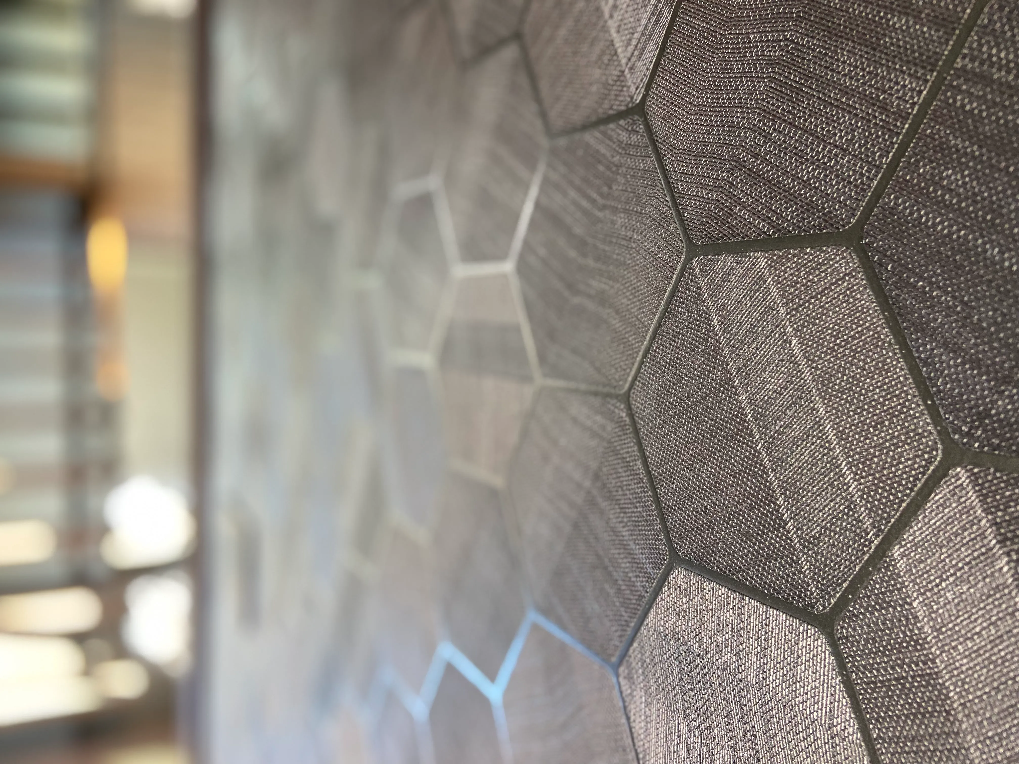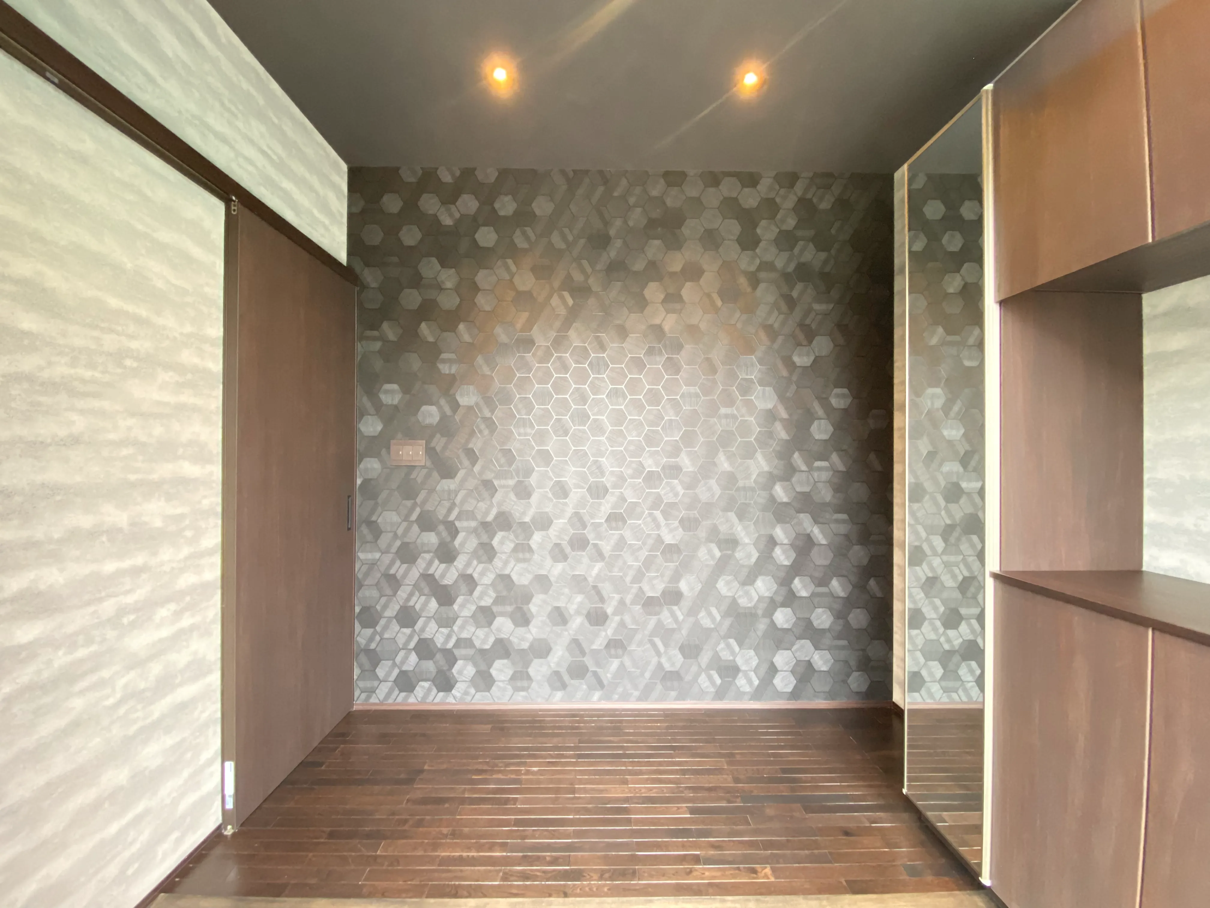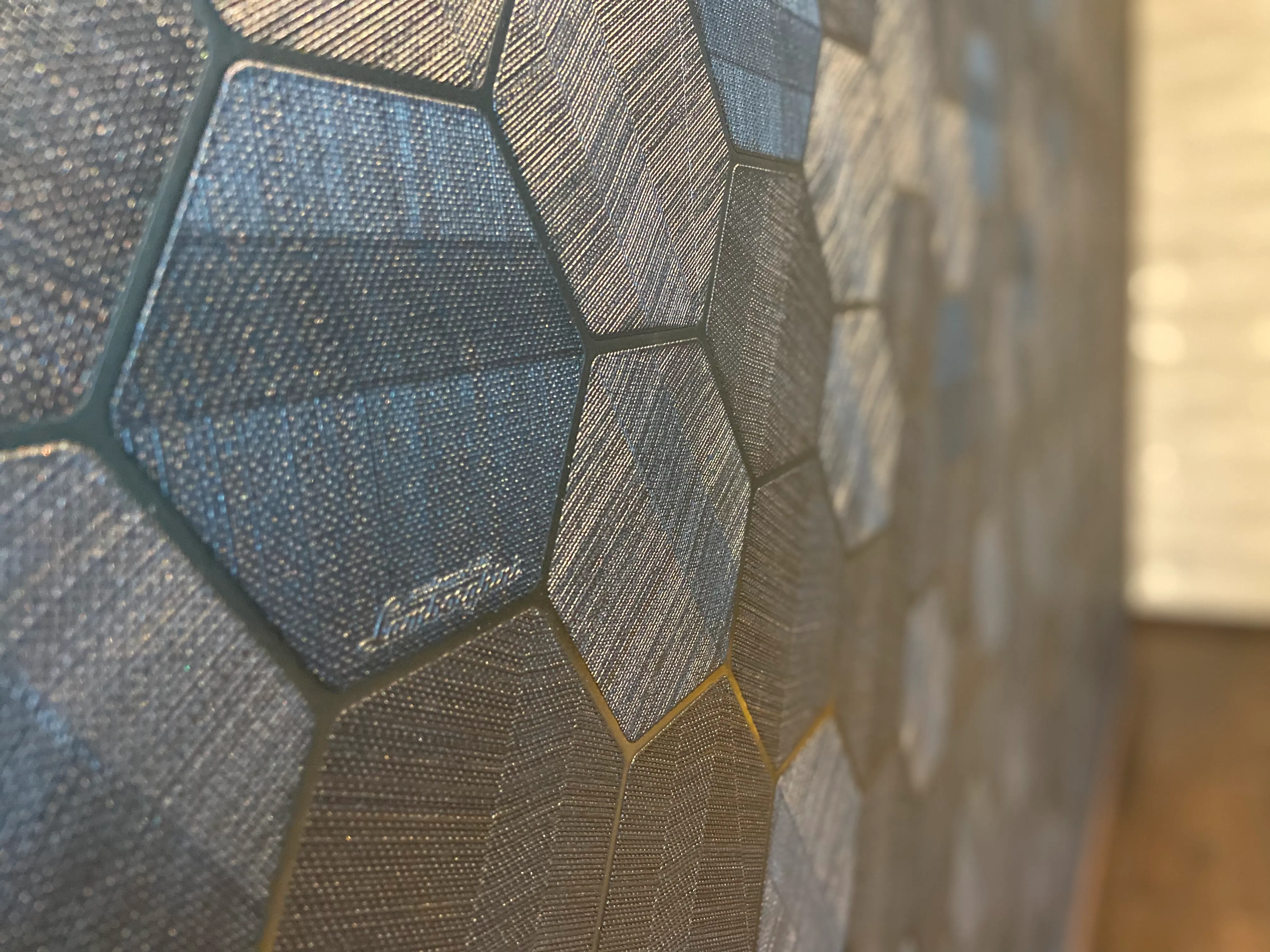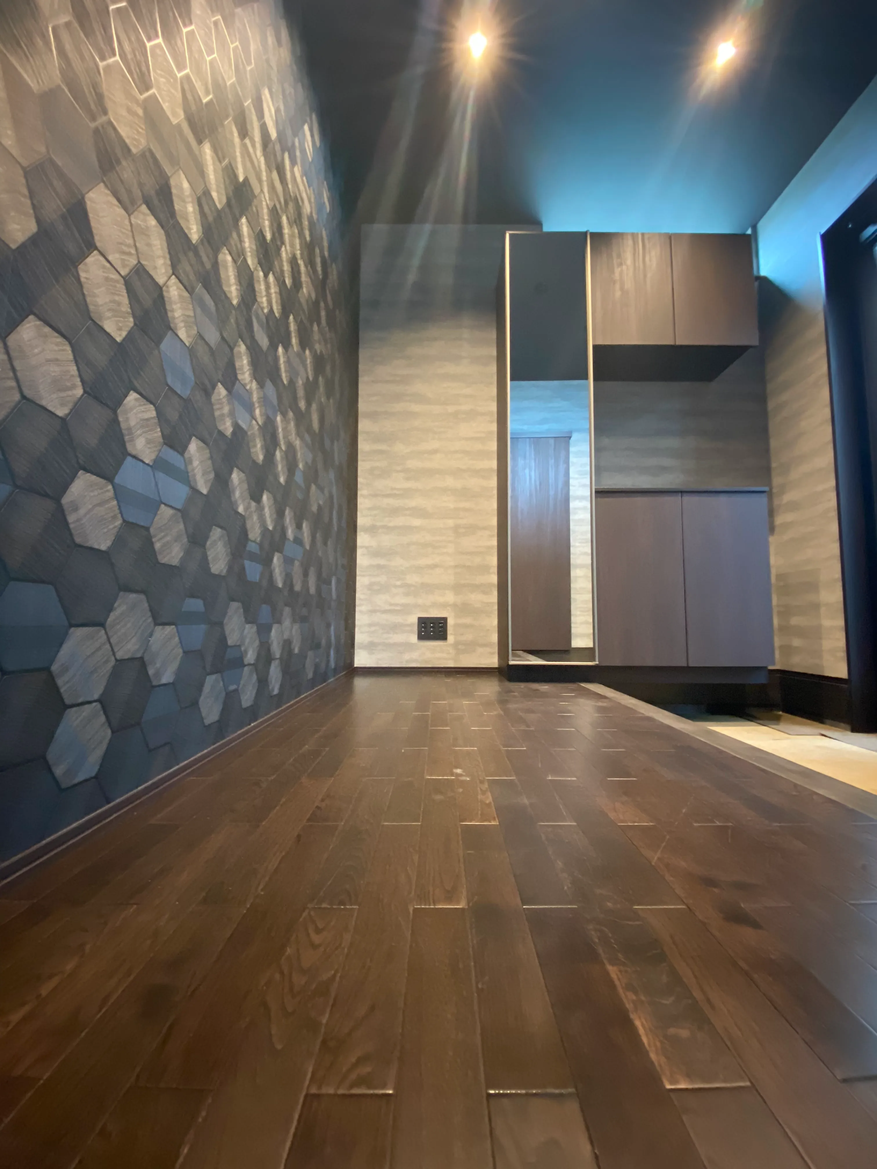 特に六角形をモチーフにした立体感のあるアクセントウォールが、空間に個性と高級感をもたらします。