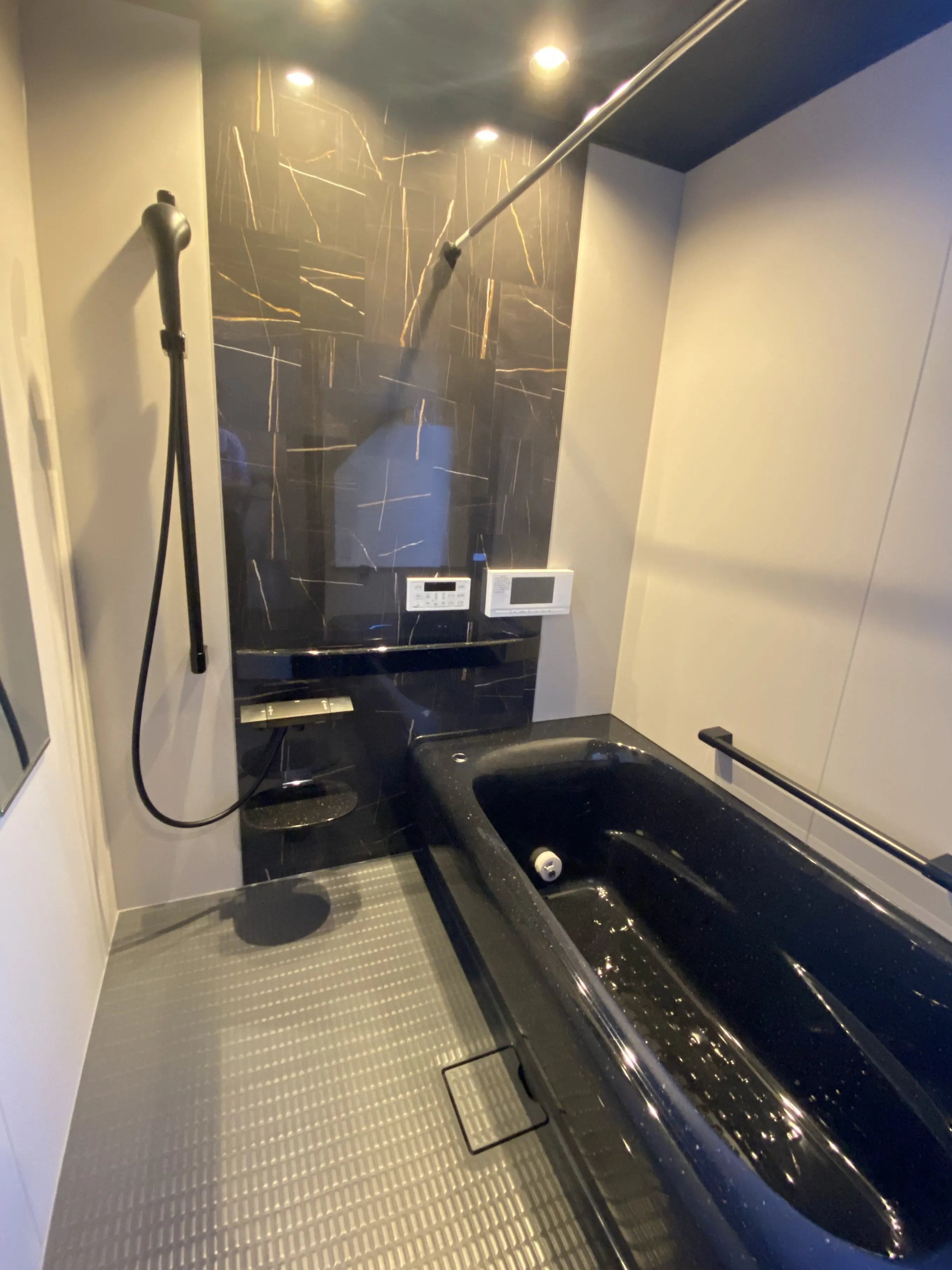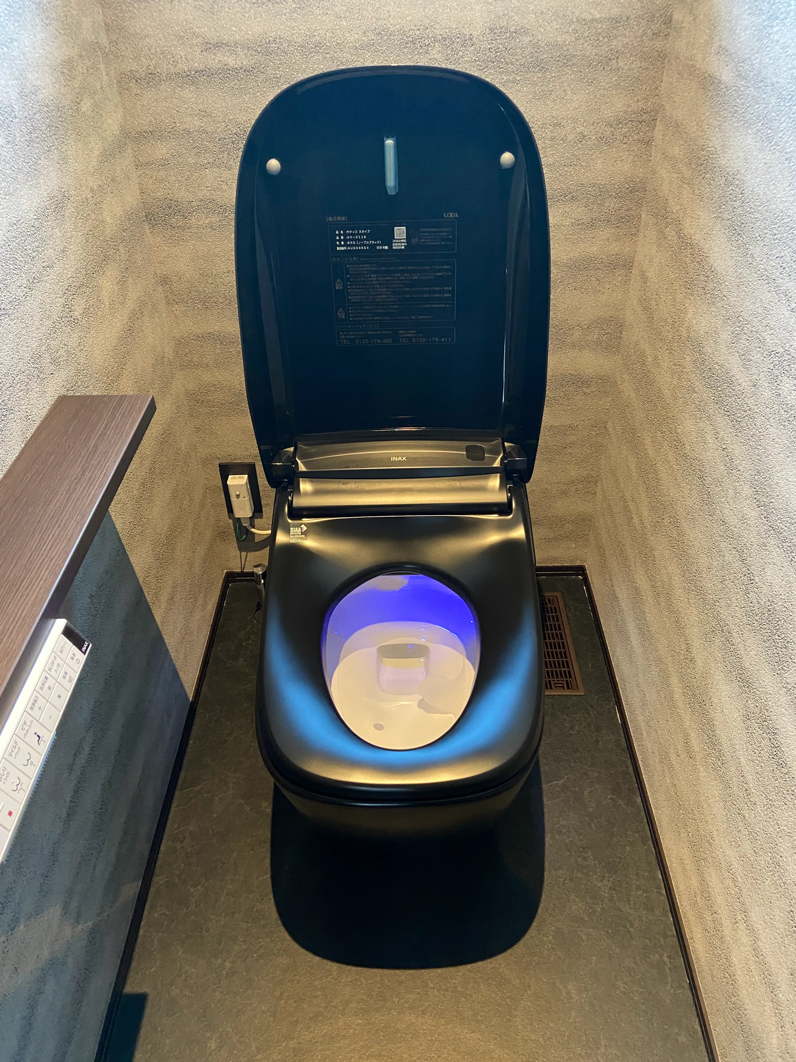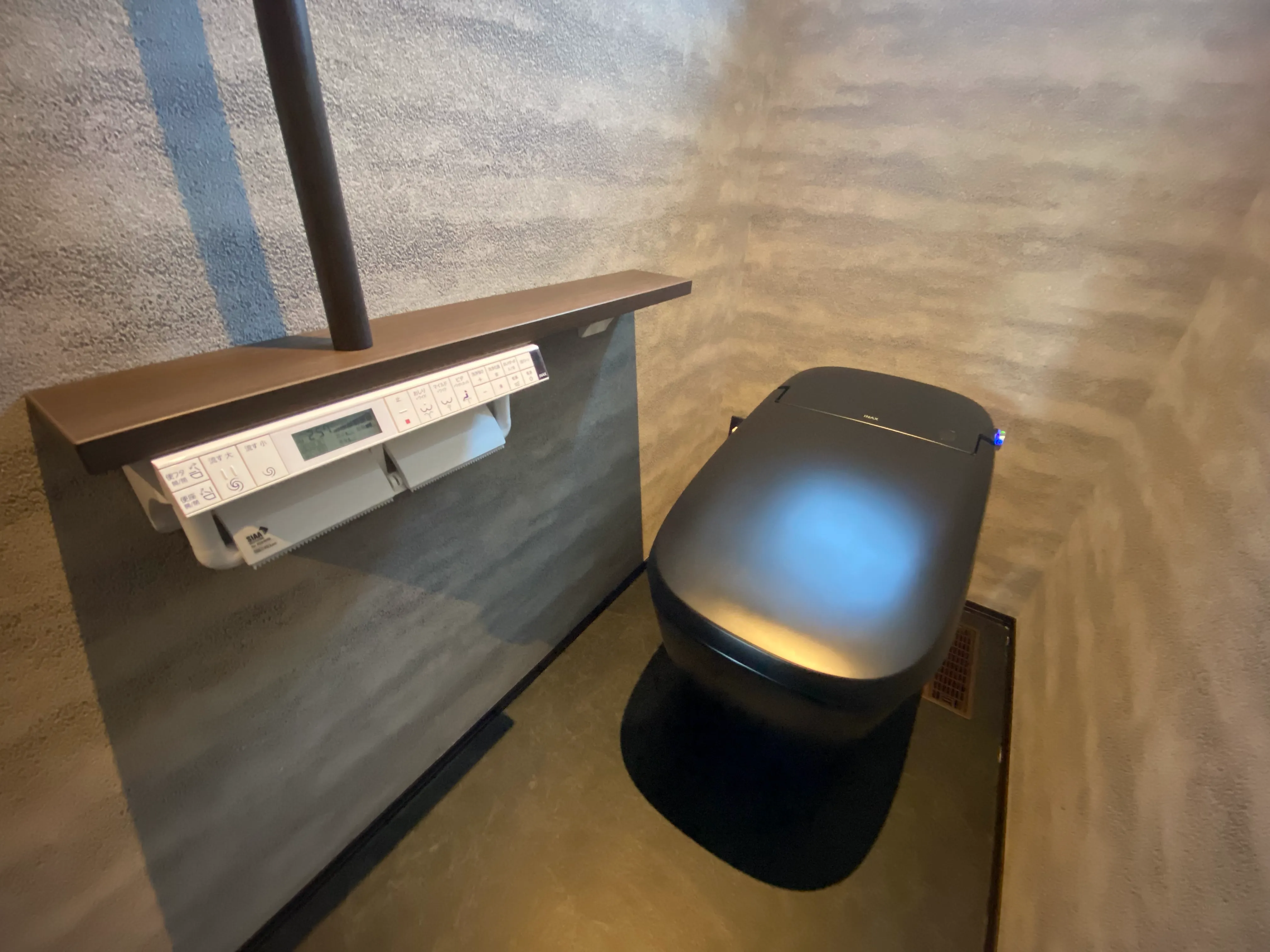 水回りもブラック基調で統一することで、引き締まった印象になります。トイレットボールのブルーLEDがスタイリッシュ感を演出。