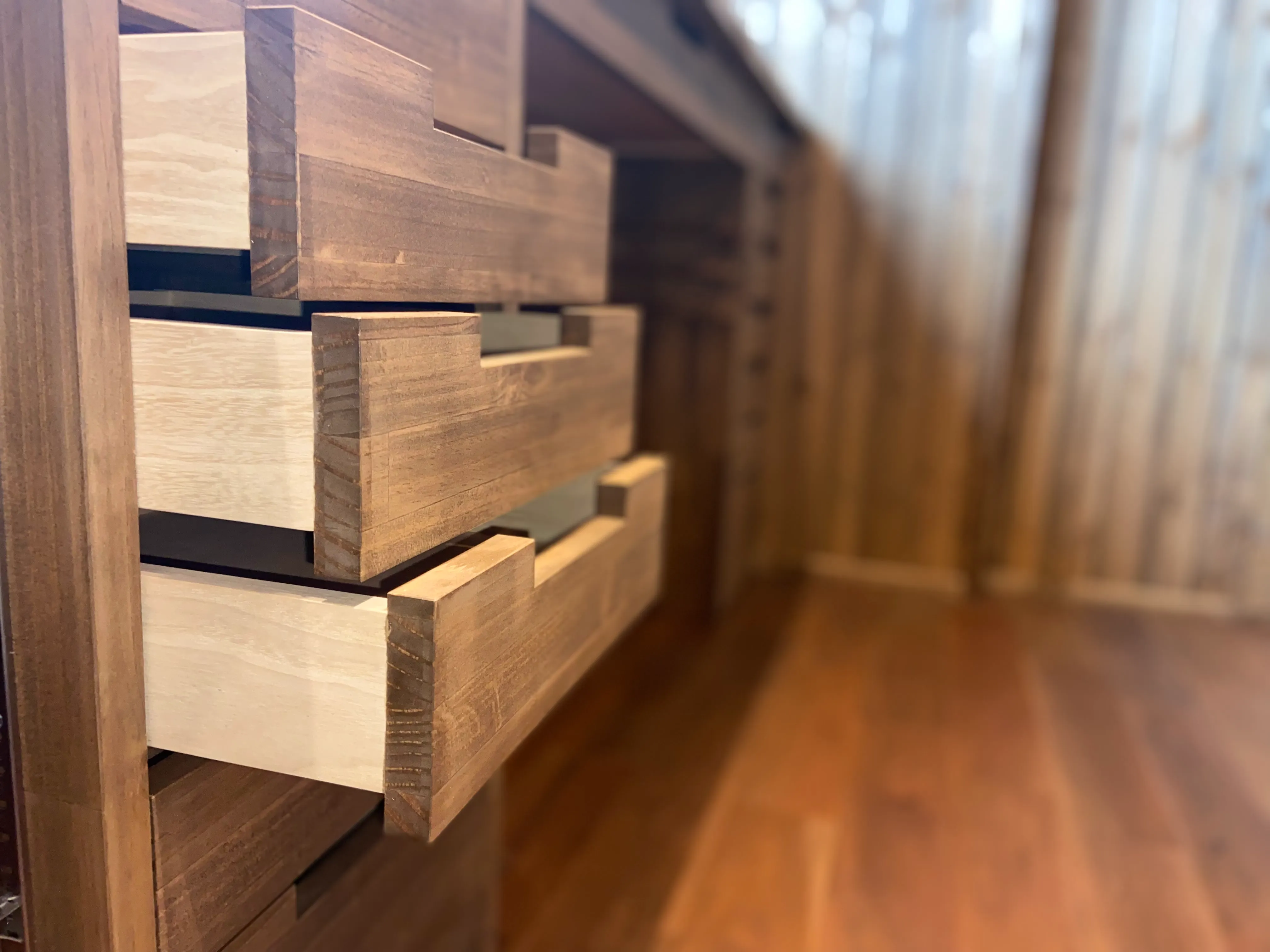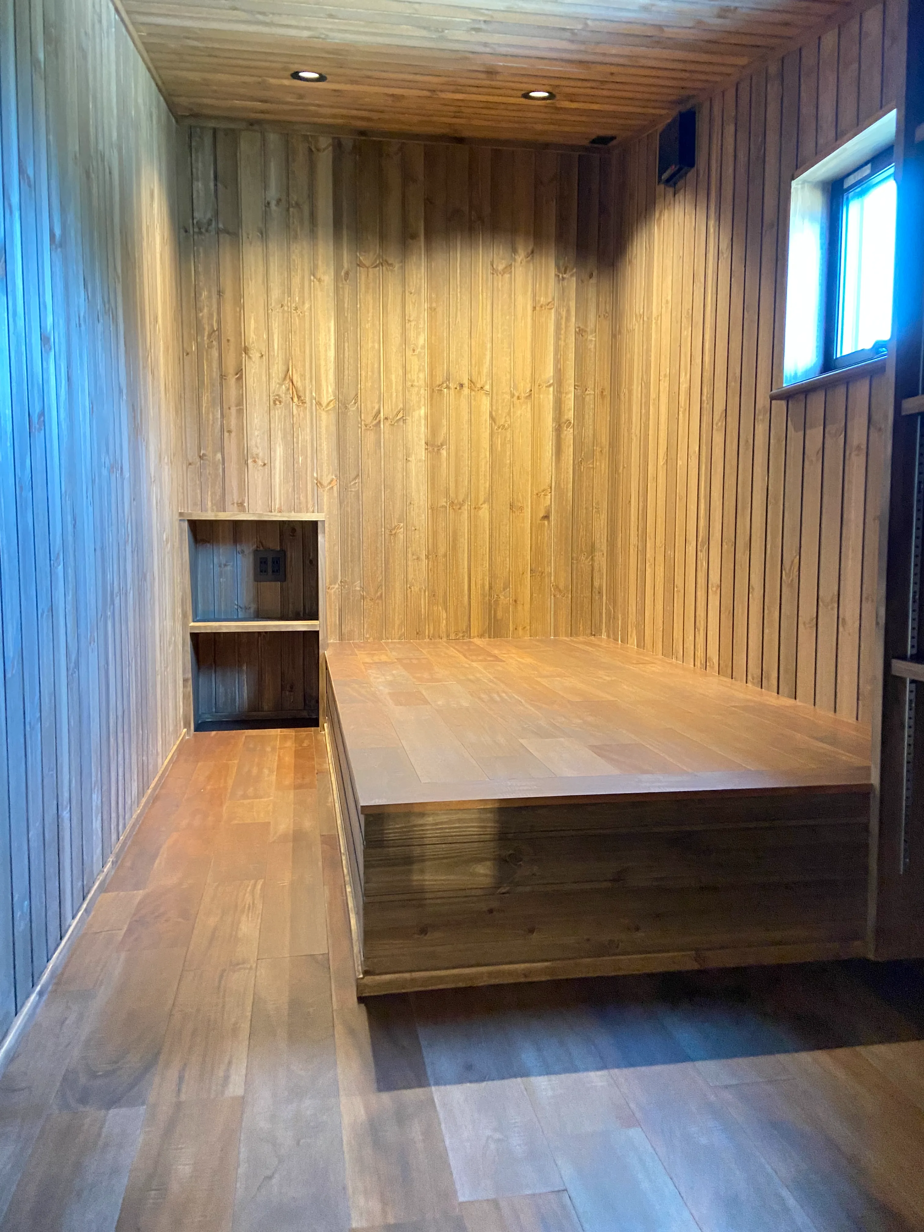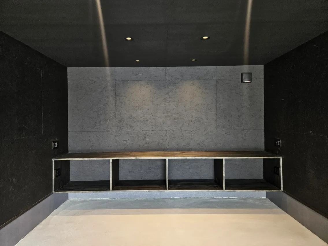 - 黒く塗装されたオーク材の床が空間全体に落ち着きと深みを演出