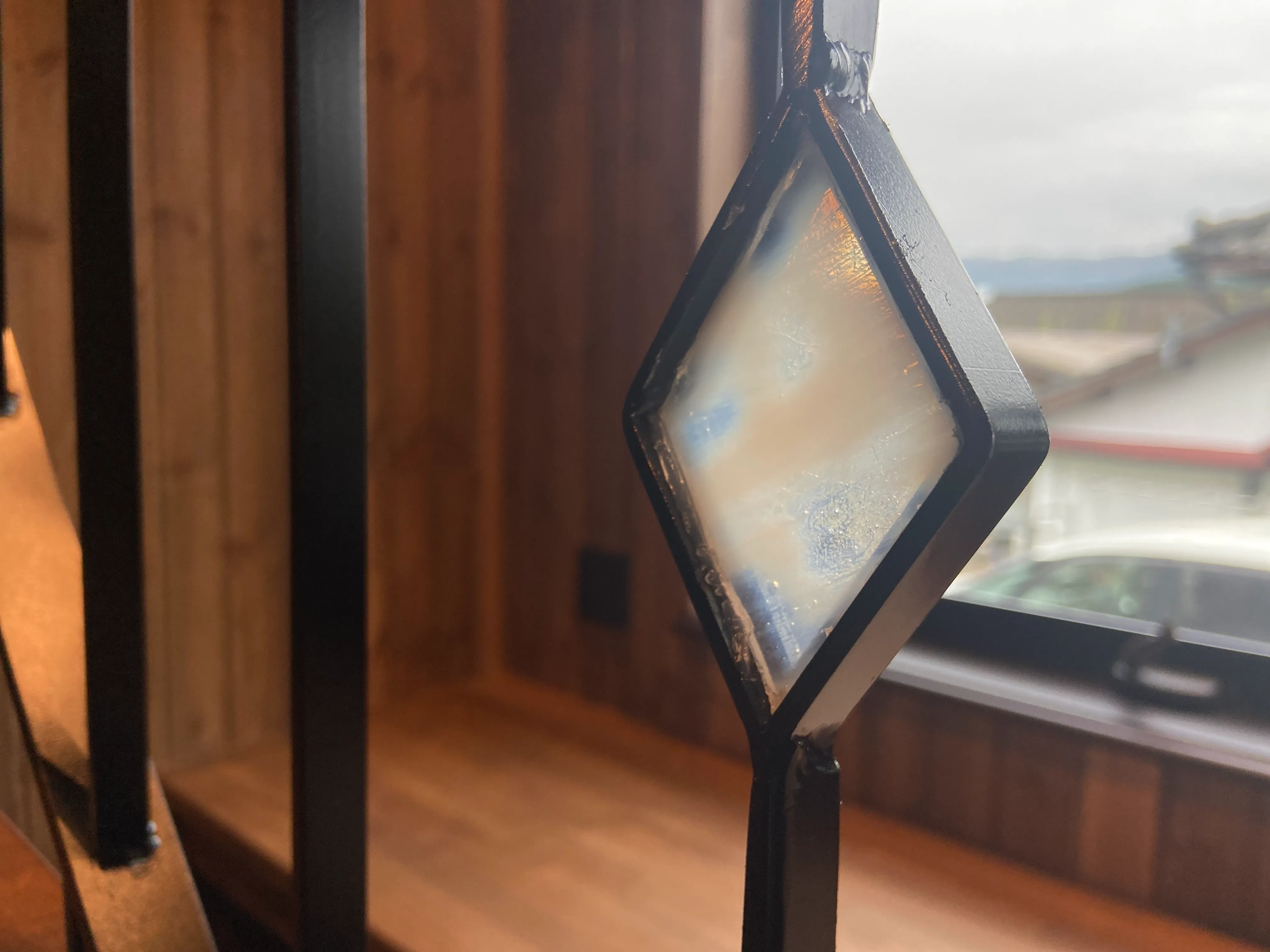 また、お施主様こだわりのステンドグラス照明や扉、手すりのアイアンが設けられ、無垢材を使った空間の中に優しく柔らかな色彩のアクセントが生きています。