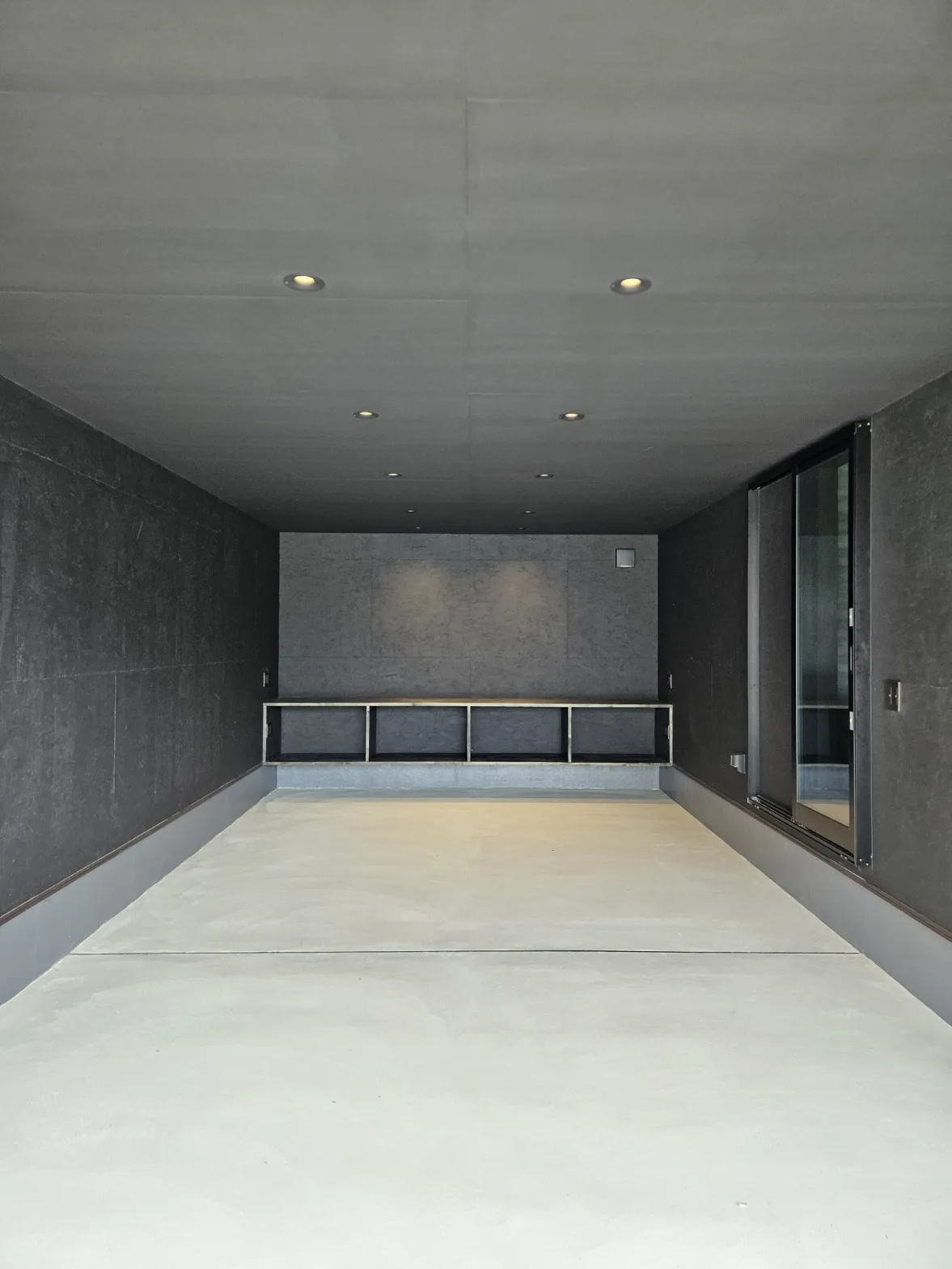 電動シャッター付きのインナーガレージを備え、機能性とデザイン性を両立しています。