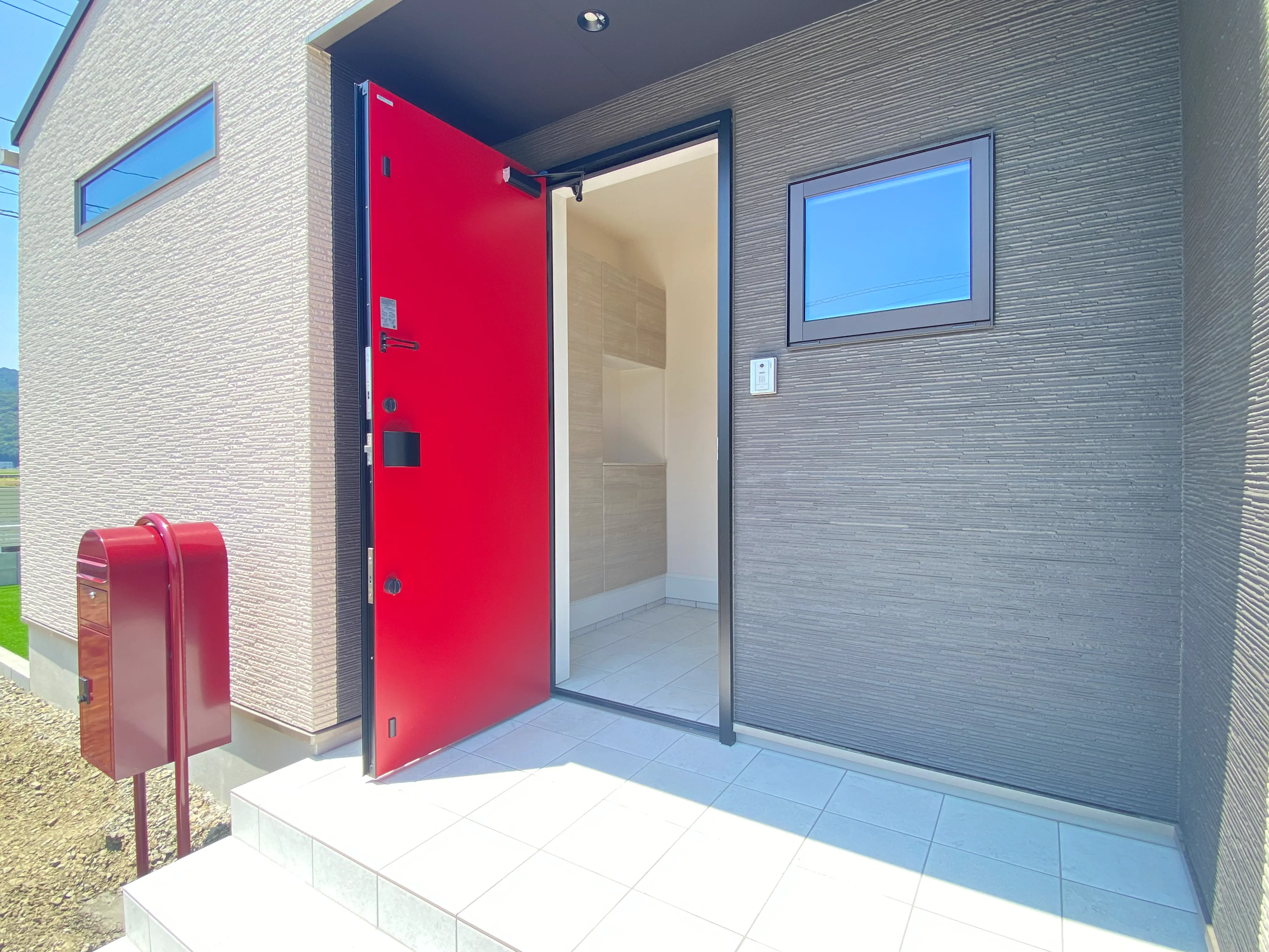 熱烈なサッカーサポーターである奥様の希望で、玄関ドアやキッチンは赤で統一。