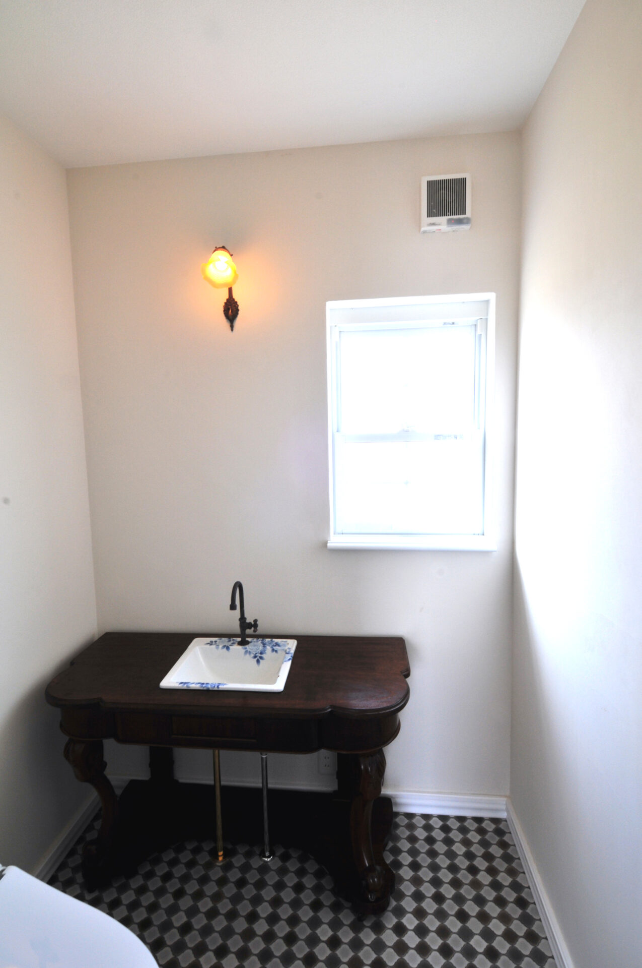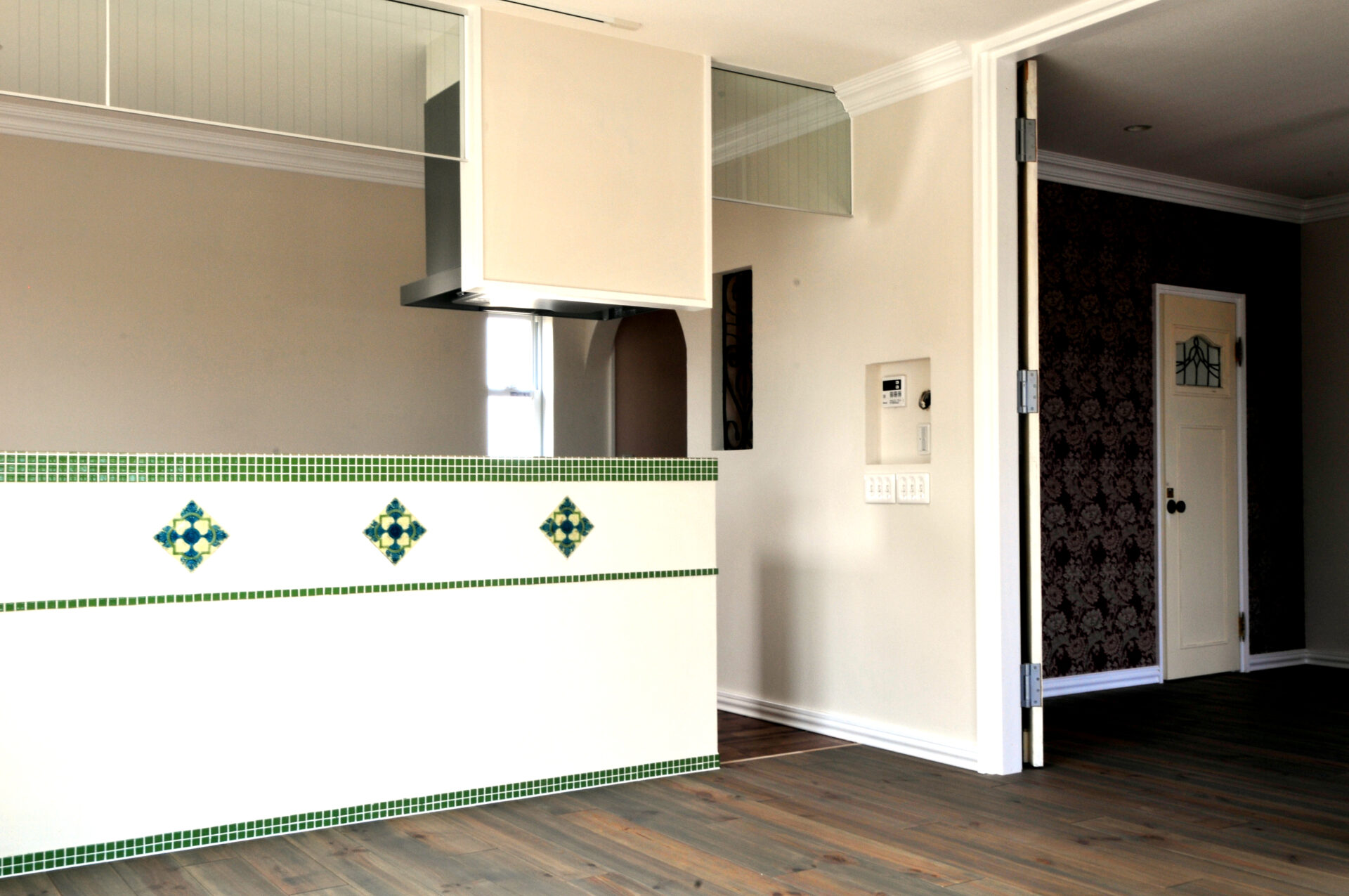 キッチンカウンターのタイル張り、アンティークテーブルを造作した手洗い洗面、梁を見せ天井高にしました。