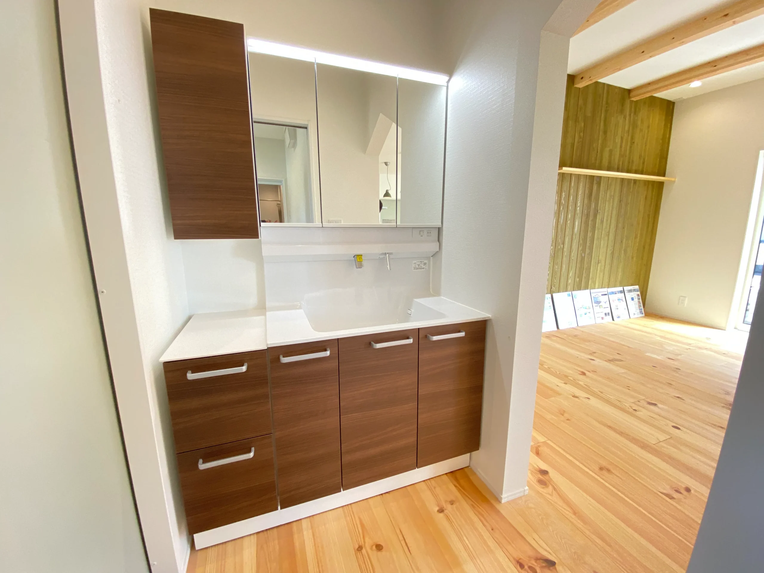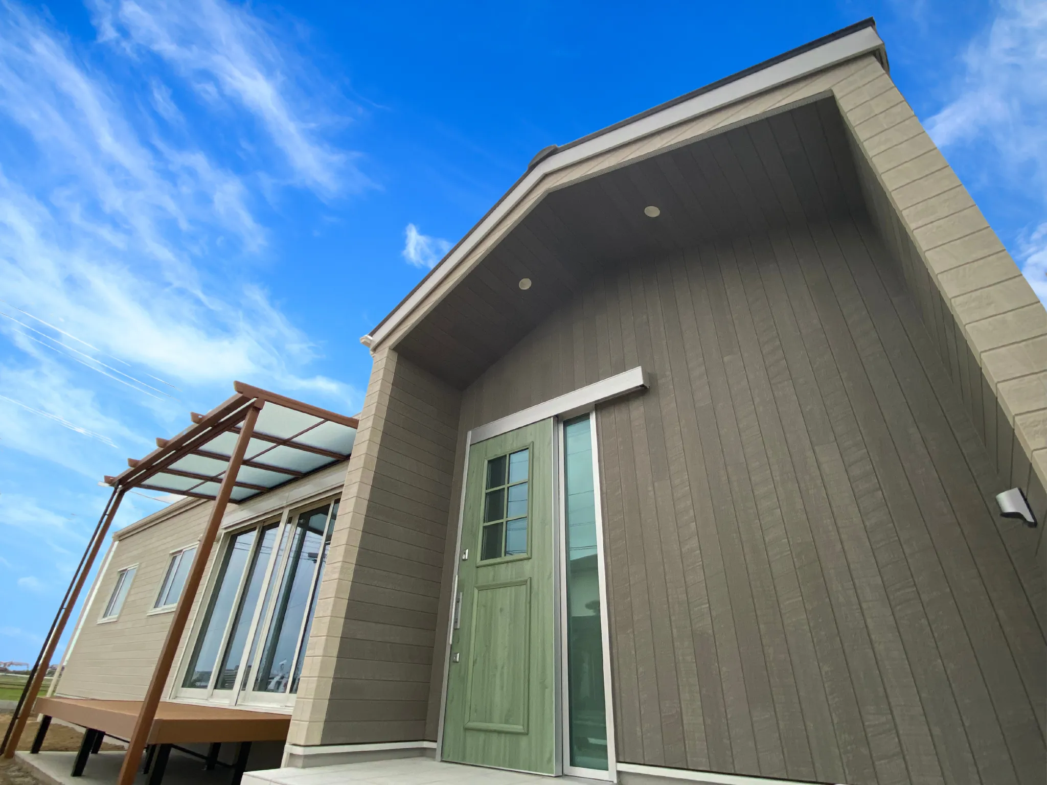 オリーブカラーの板壁や、オープン洗面、パーゴラ風シェード付きテラス、高級キッチンなどこだわり満載です。