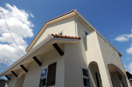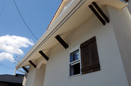 軒下の梁見せ、上げ下げ窓の飾り雨戸、アーチの外壁など本格プロヴァンス住宅です。