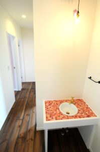 造作のTVボードや物入・カウンター、曲線の壁棚、タイル張りの手洗い洗面、手すりはアイアンを使用。