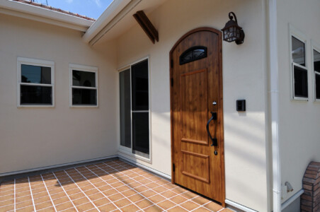 素焼きの瓦とあわせた玄関ポーチのタイル、上げ下げ窓、母屋と一体化したガレージが印象的。
