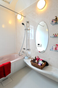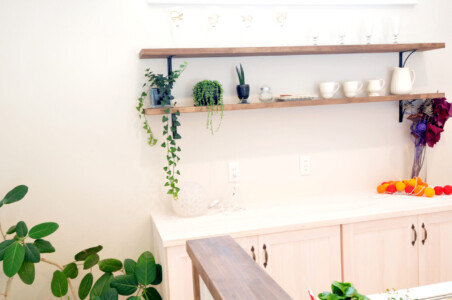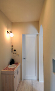 造作棚で見せる収納、ニッチ、造作のタイル張り手洗い洗面を設置し、壁や玄関、ガレージも曲線を使用し柔らかく優しいに。