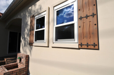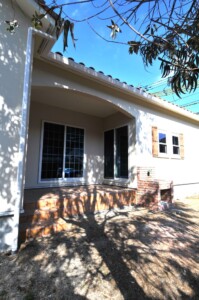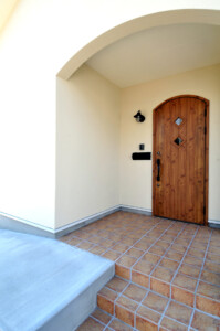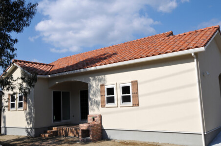玄関とテラスの軒の大きな曲線、上げ下げ窓の飾り雨戸、素焼きの瓦が本格的なプロヴァンス住宅です。