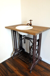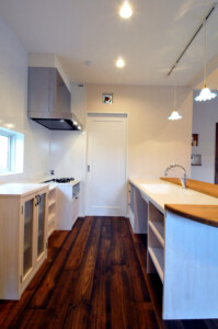 キッチン、カウンターテーブル、背面収納、古いミシンを使用した手洗い洗面、物入収納など奥様のちょうどよいサイズに造作しました。