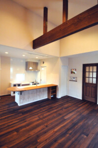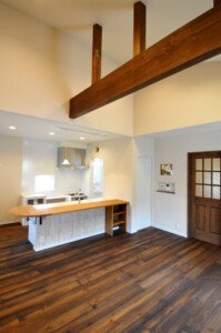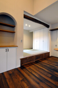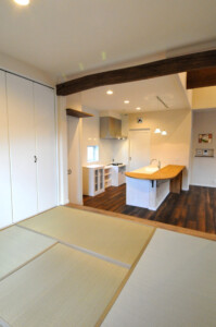 キッチンの隣に和室を設け小上がりし、床下は引き出し収納に、和室とリビングは梁を見せ開放感をプラス。