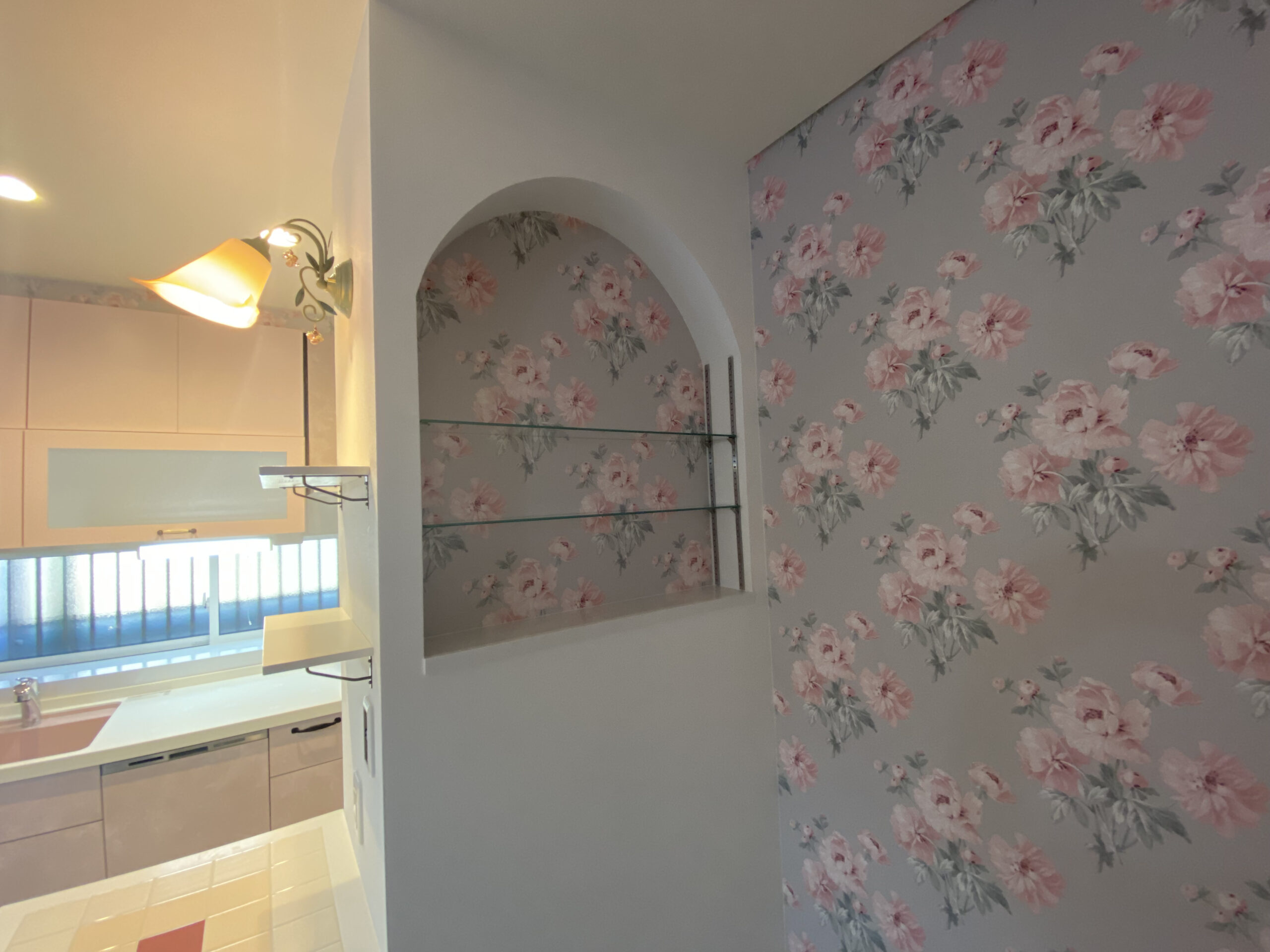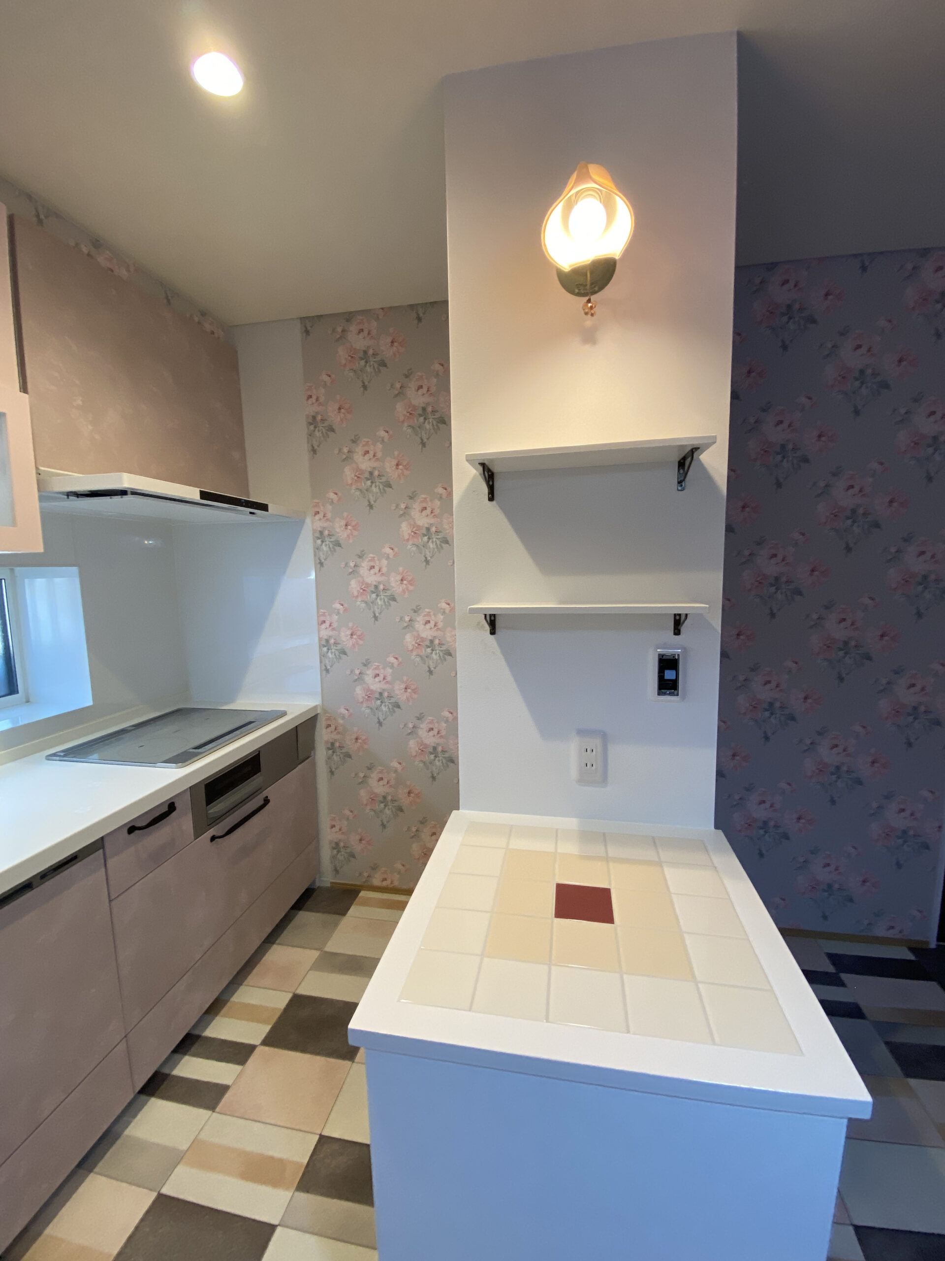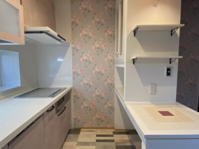 キッチンはお施主様のお好きなカラーデザインで統一し、英国ブランドであるローラーアシュレイデザインのクロスをチョイス。