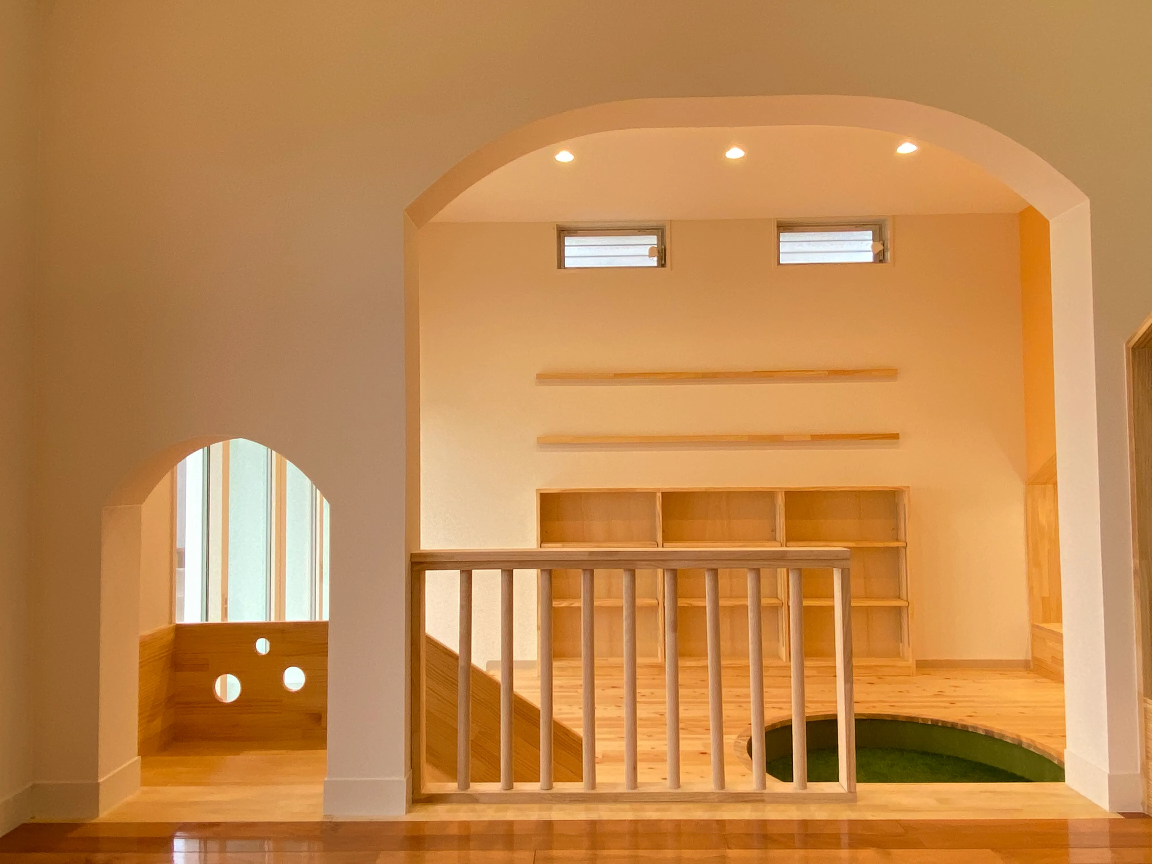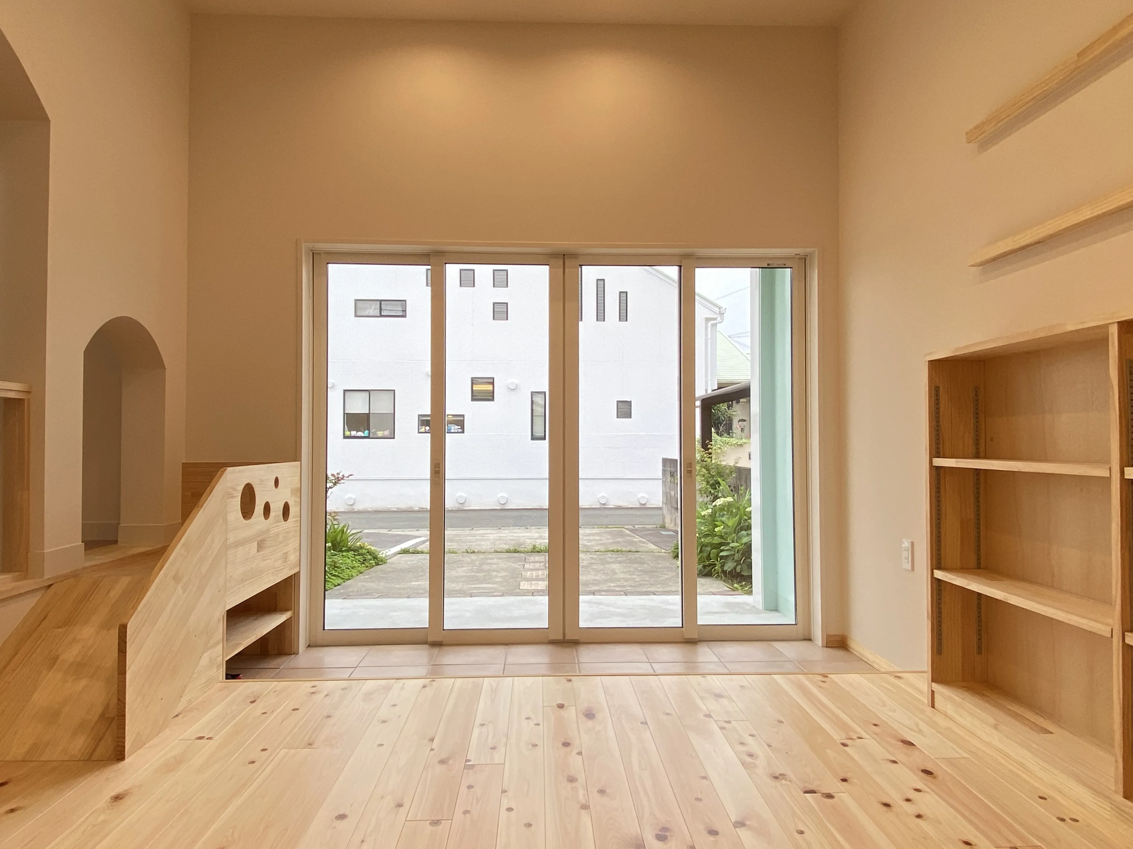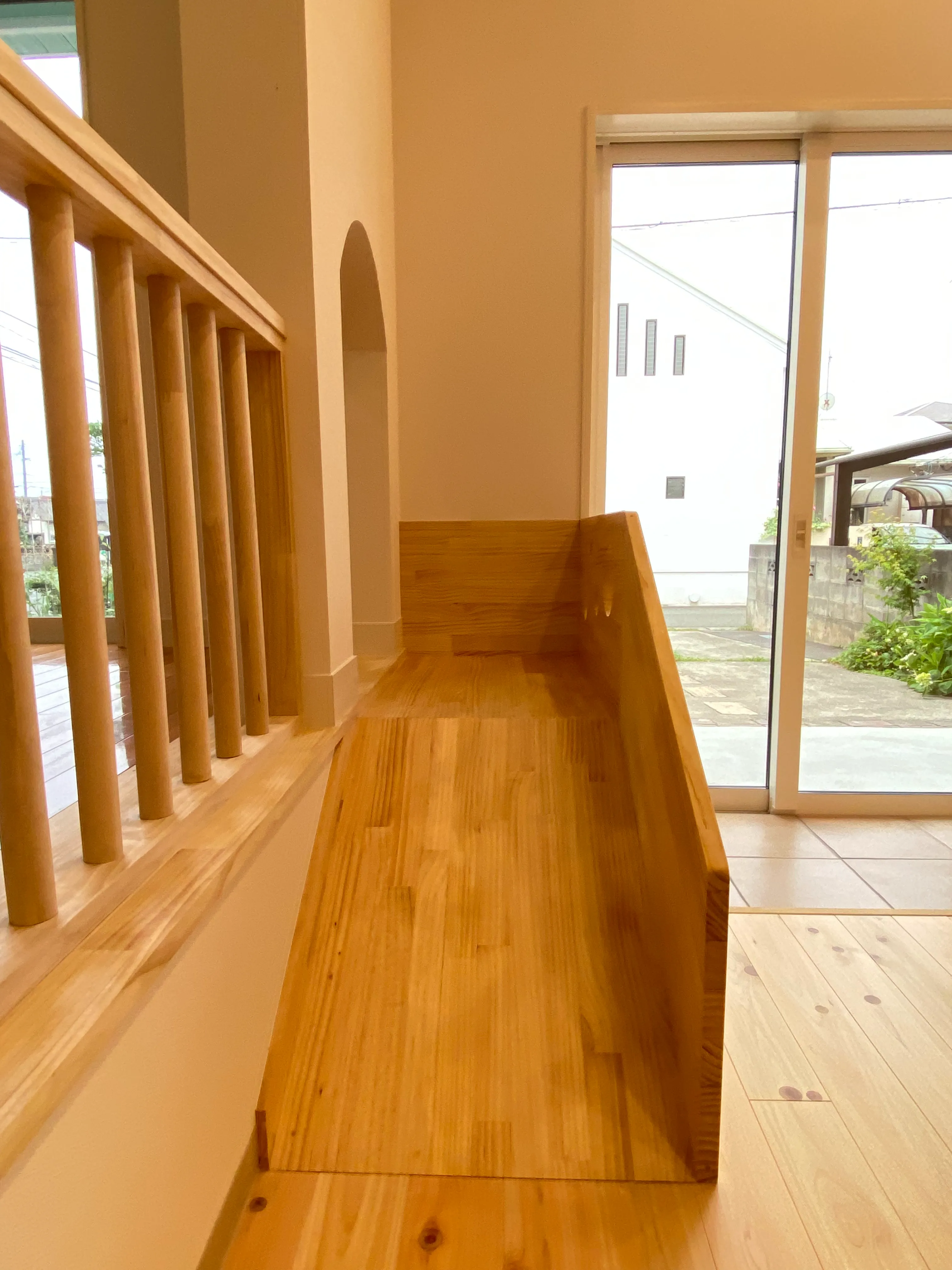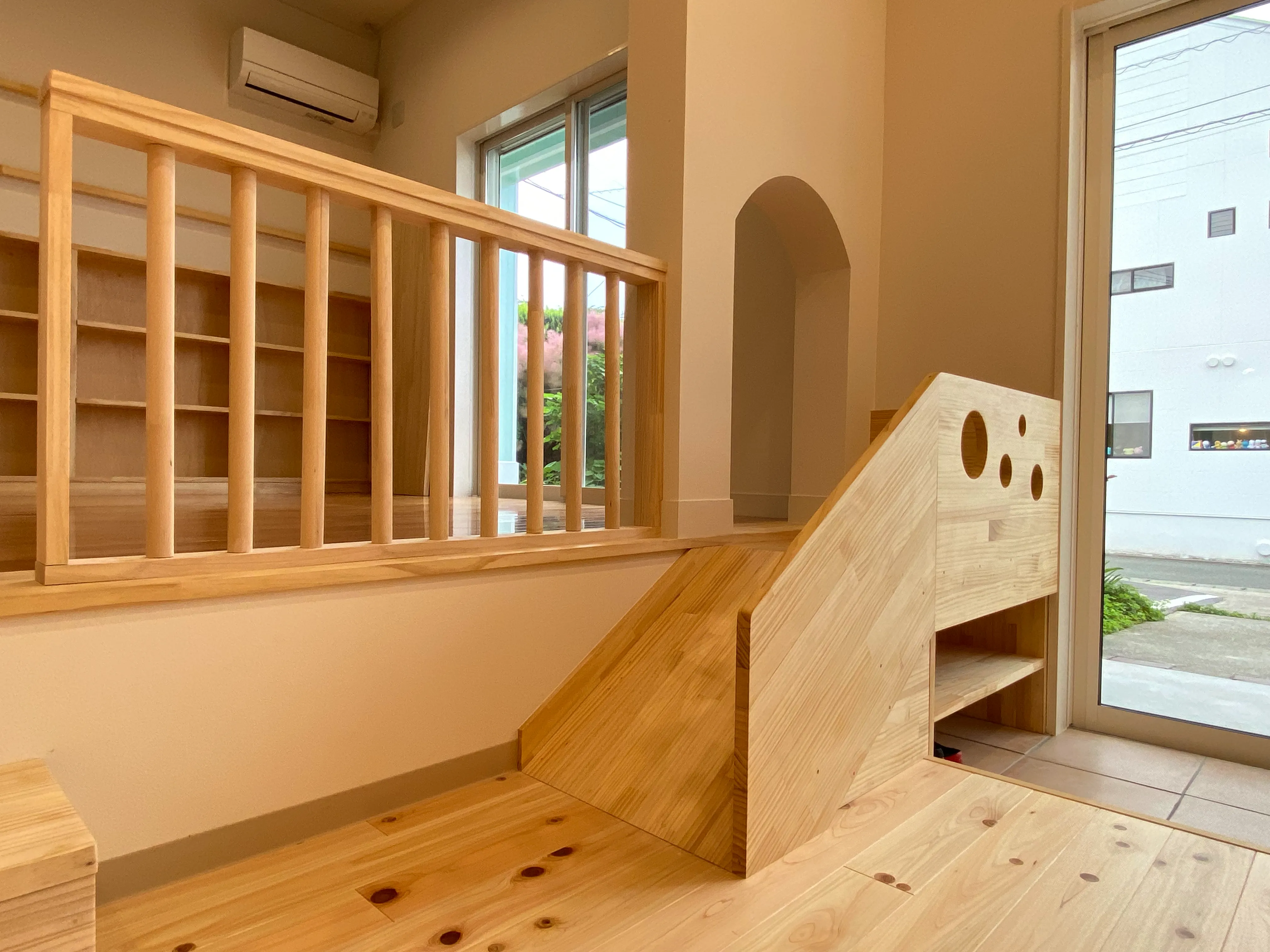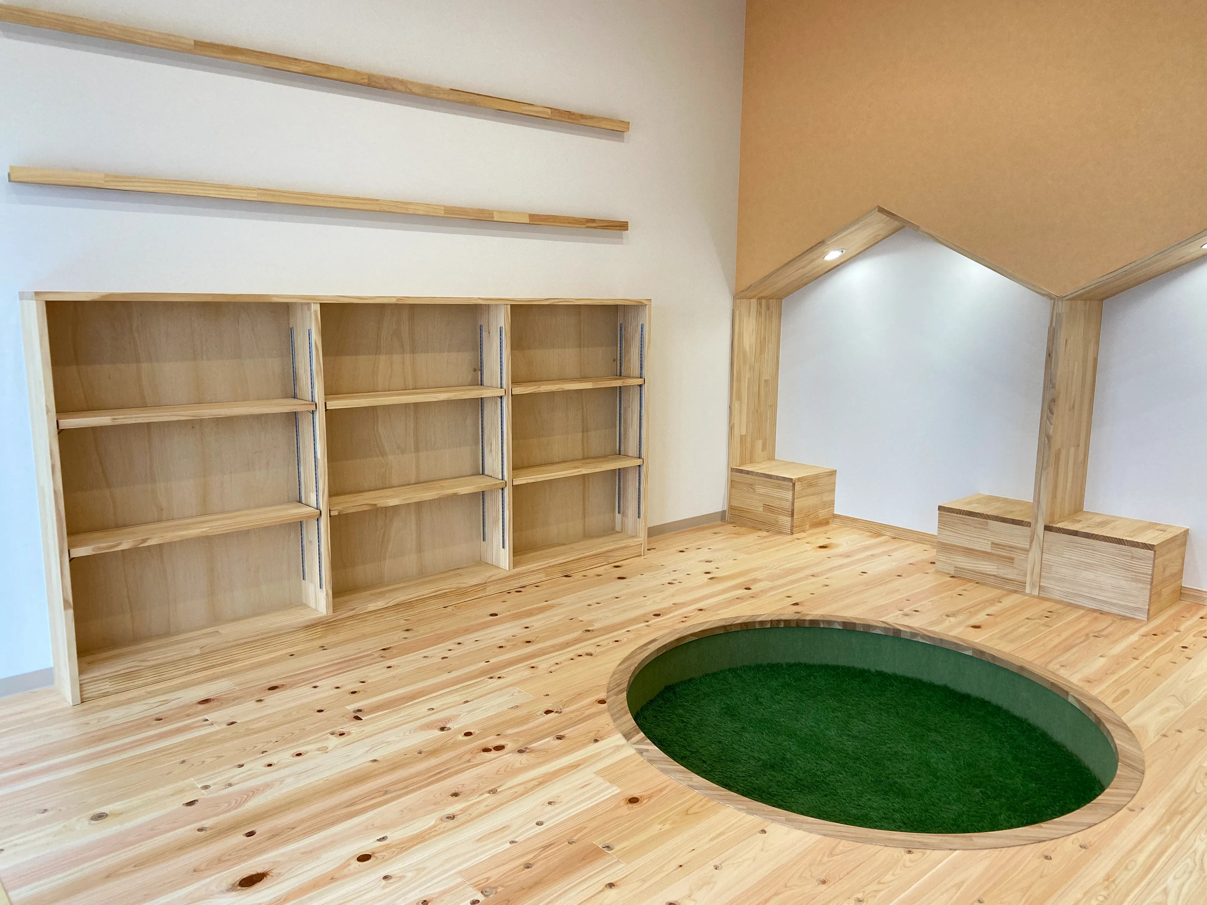 本棚や読み聞かせ用ベンチ、子ども用のすべり台などもすべて造作。