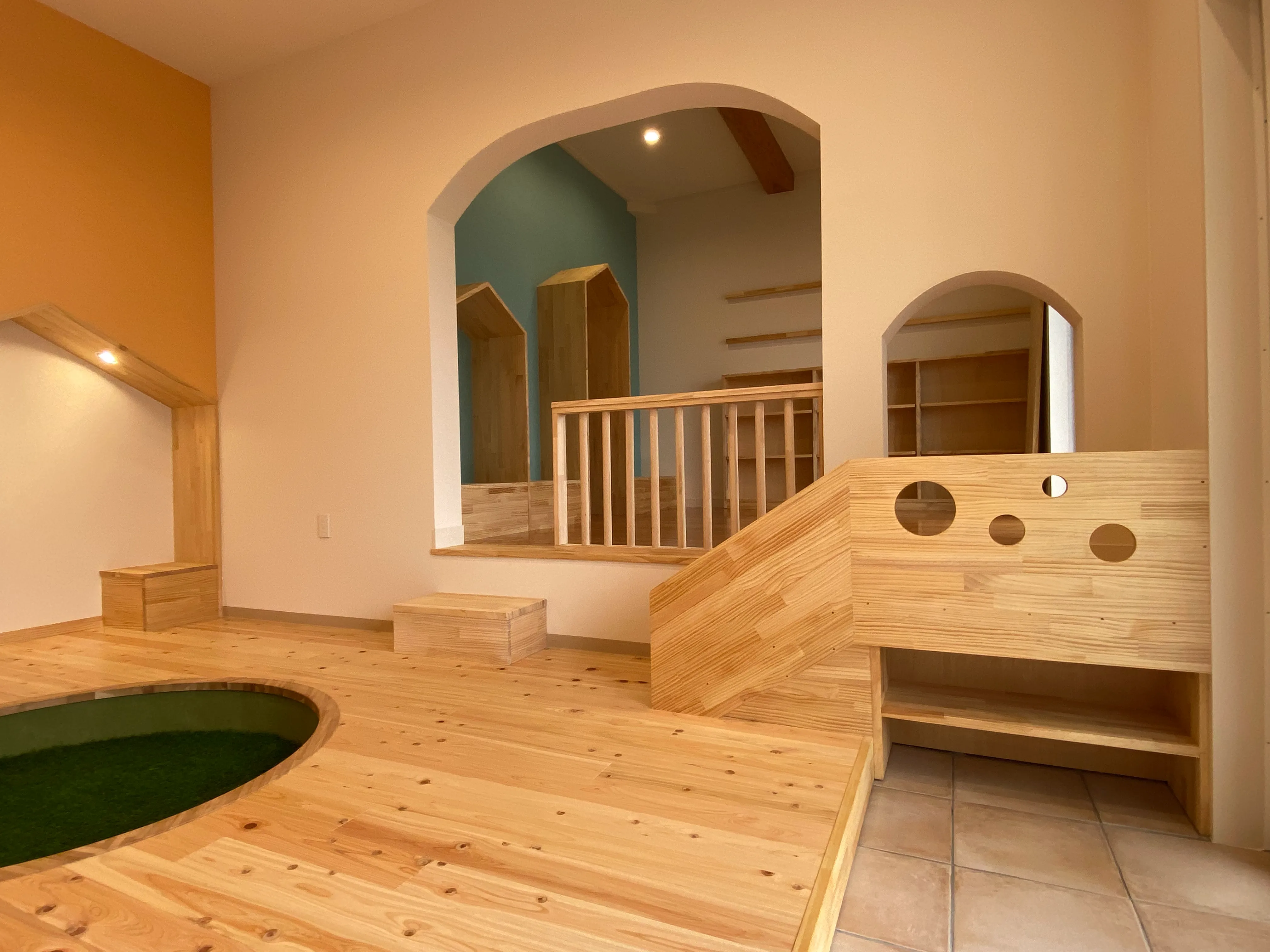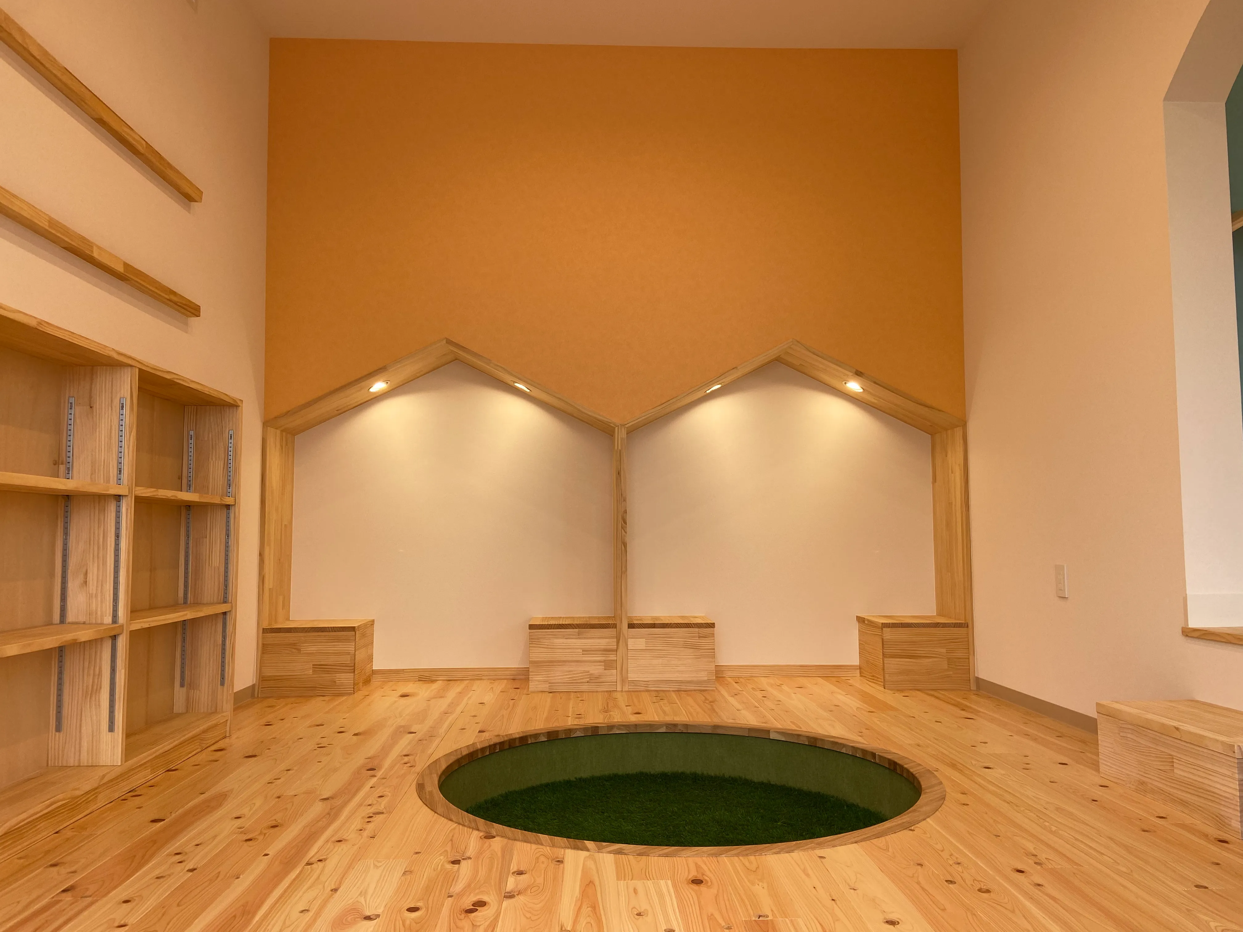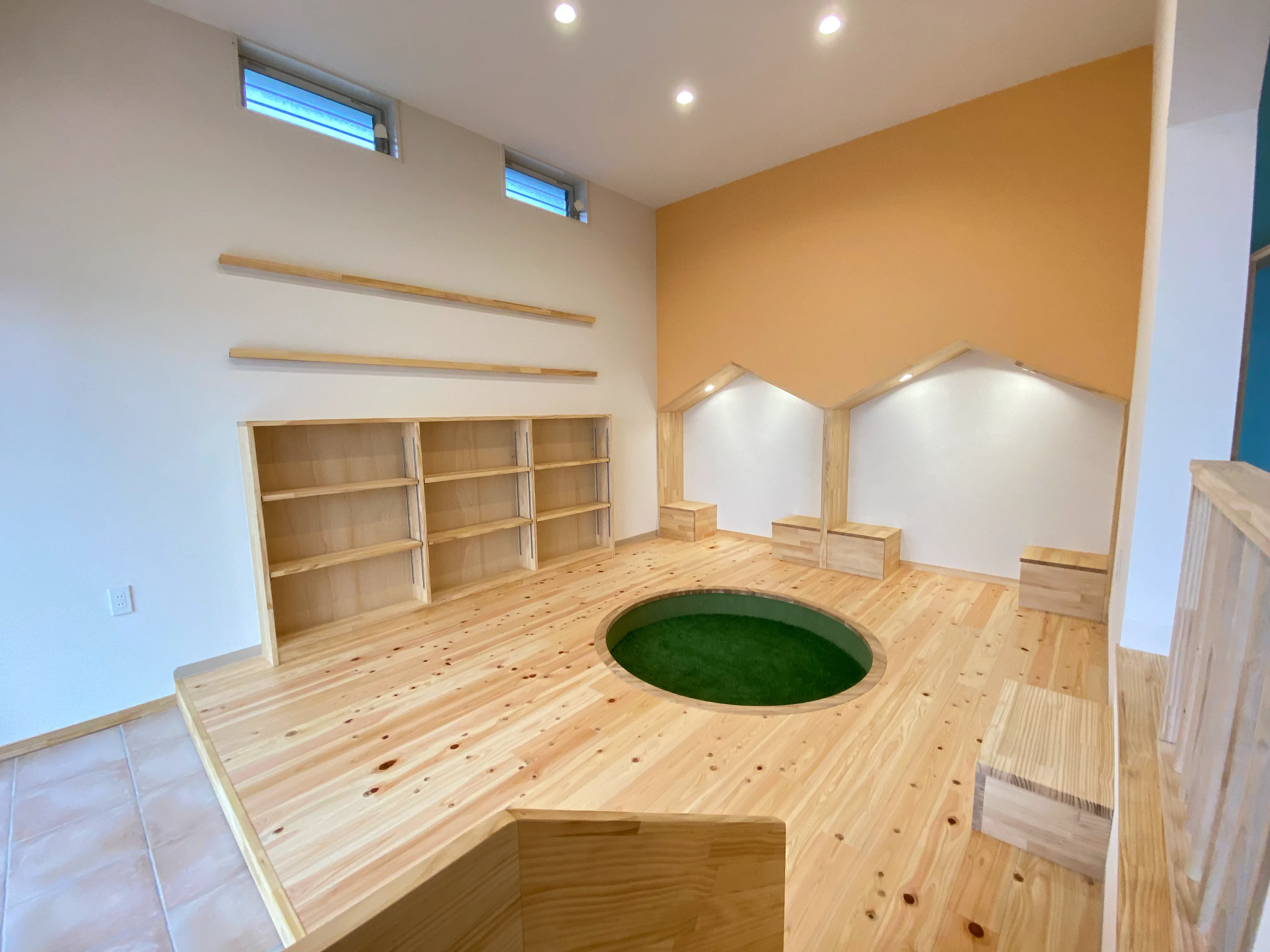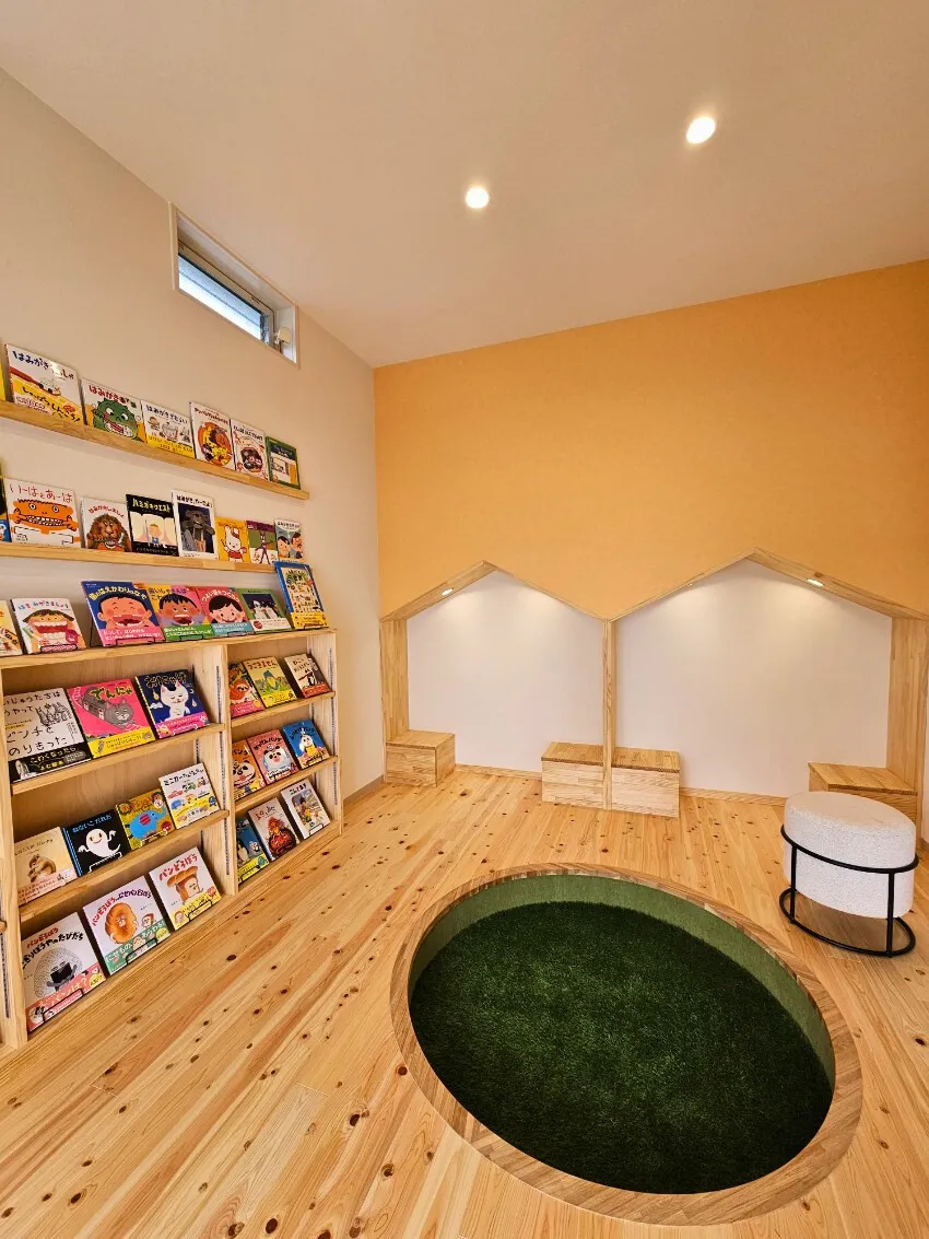 お子さまが床に寝っ転がって本を読んだり、本読みコーナーで親御さんと一緒に楽しめる開放感たっぷりの空間に仕上げました。