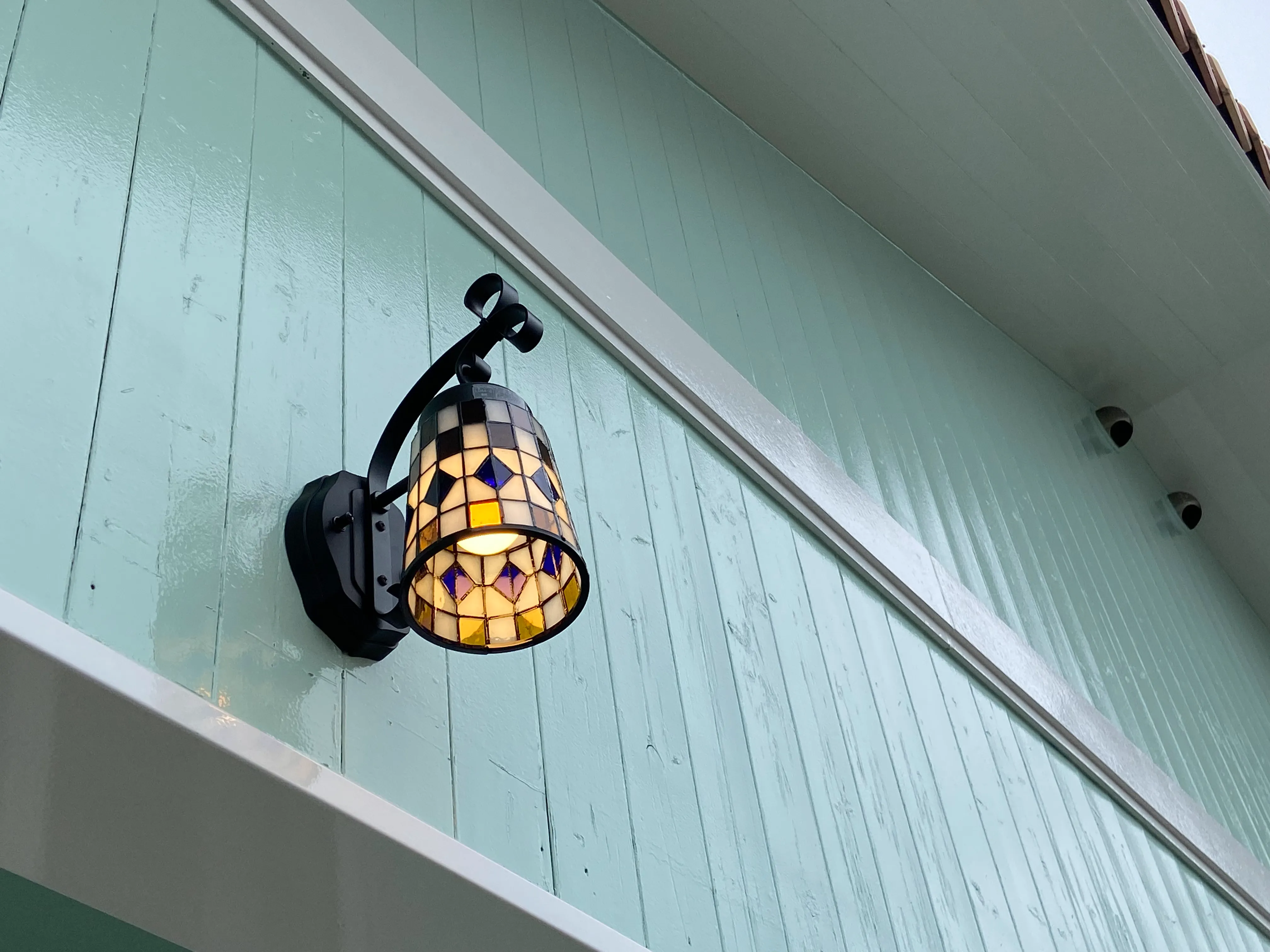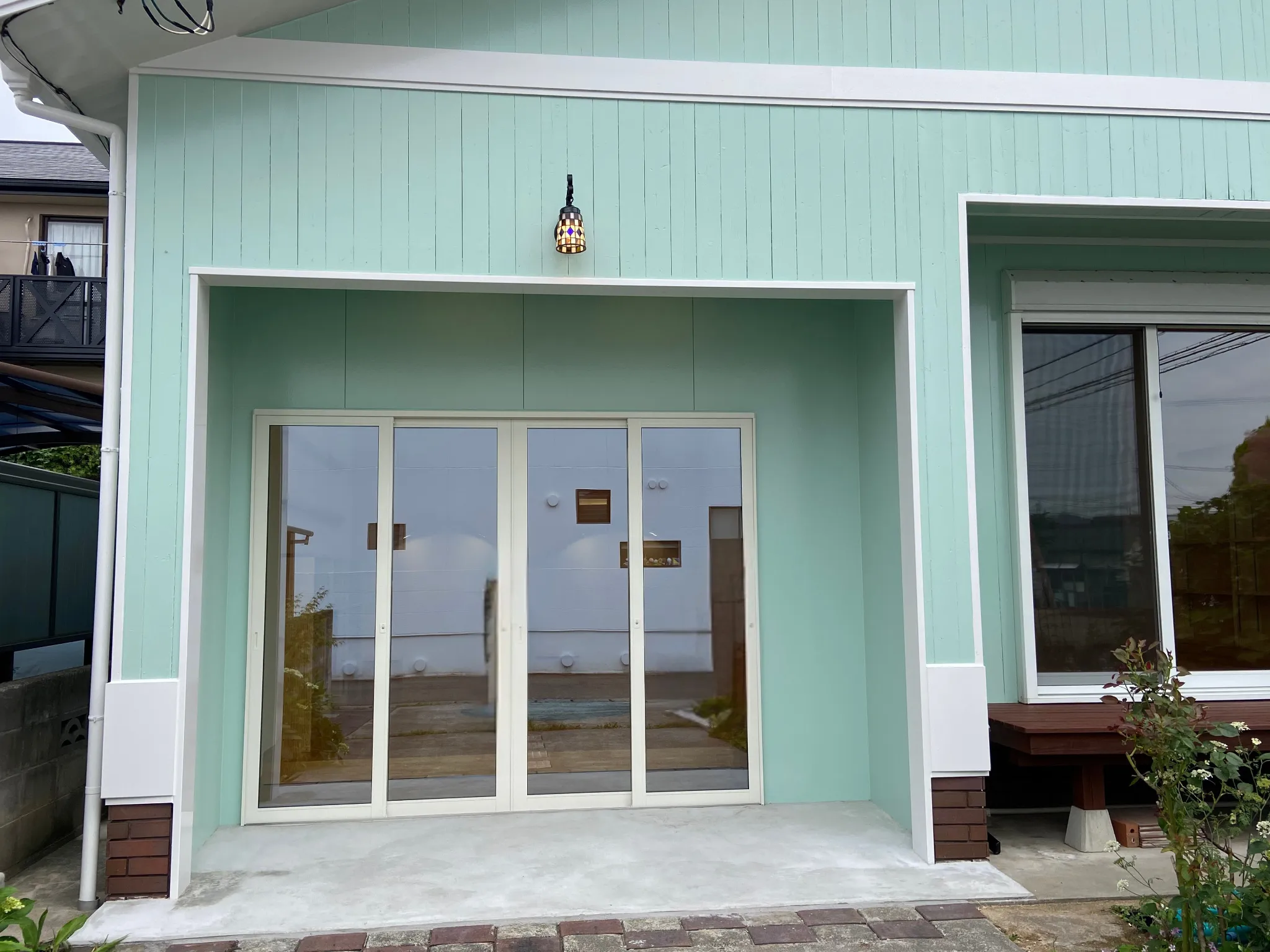 絵本の世界観を表現するため、外壁は明るいライムグリーンに塗装。サッシはホワイトで統一、ブラケットライトはステンドグラス仕様。