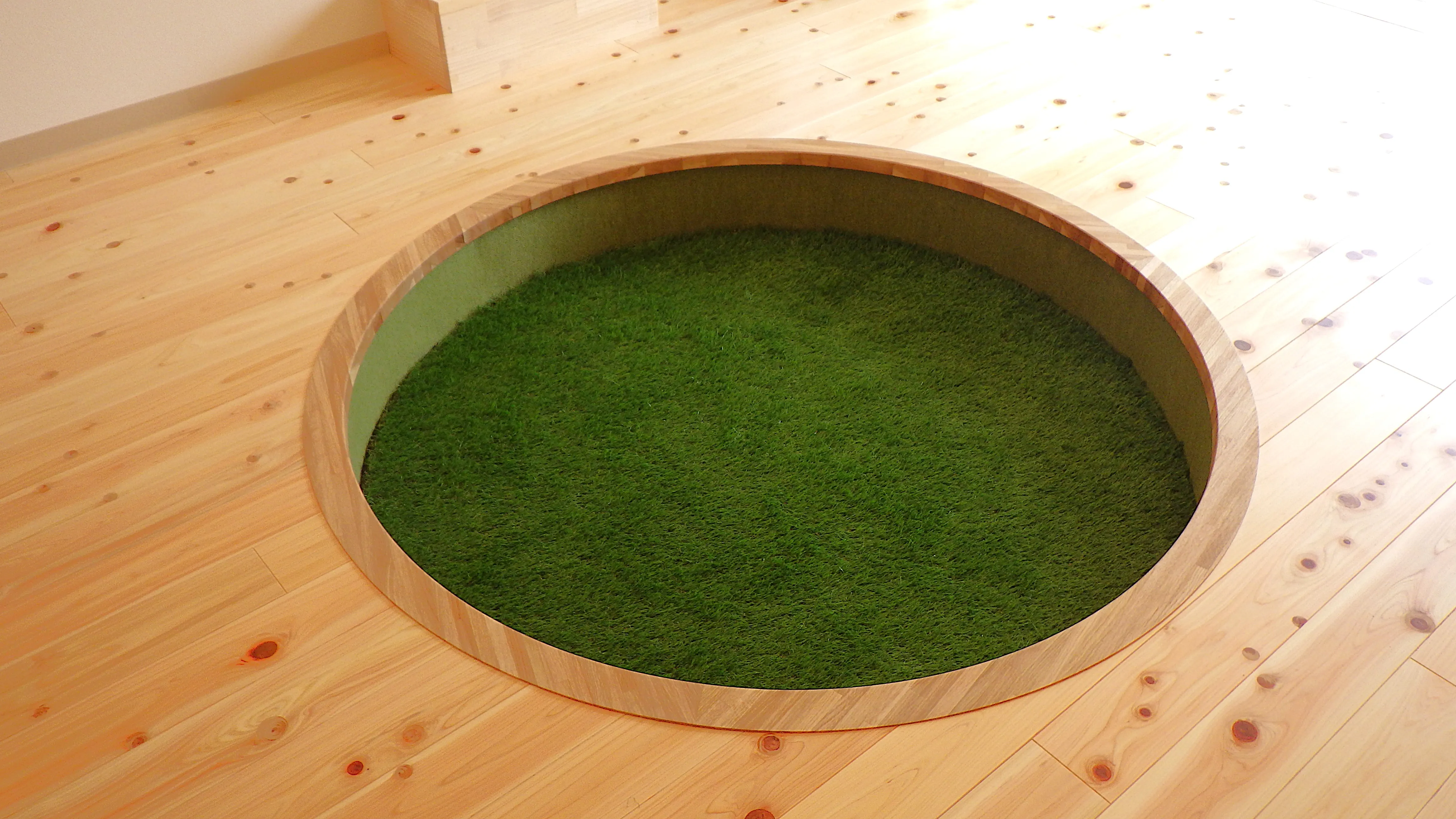 元々のインナーガレージ(約8帖)は、掘込床に人工芝を敷き詰めたライブラリーコーナーに。