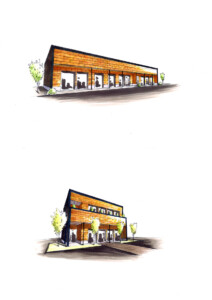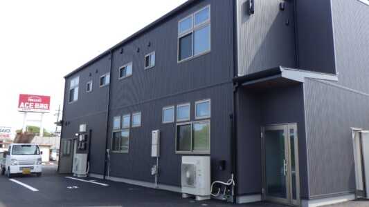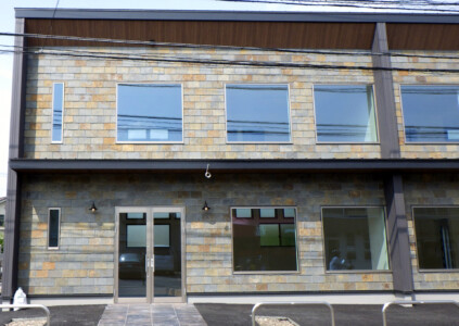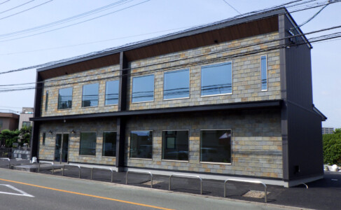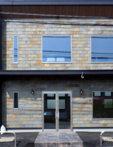 金属のガルバリウム外壁と天然石外壁のコラボデザインが魅力的な2階建。1階はテナント、2階は事務所の作りです。