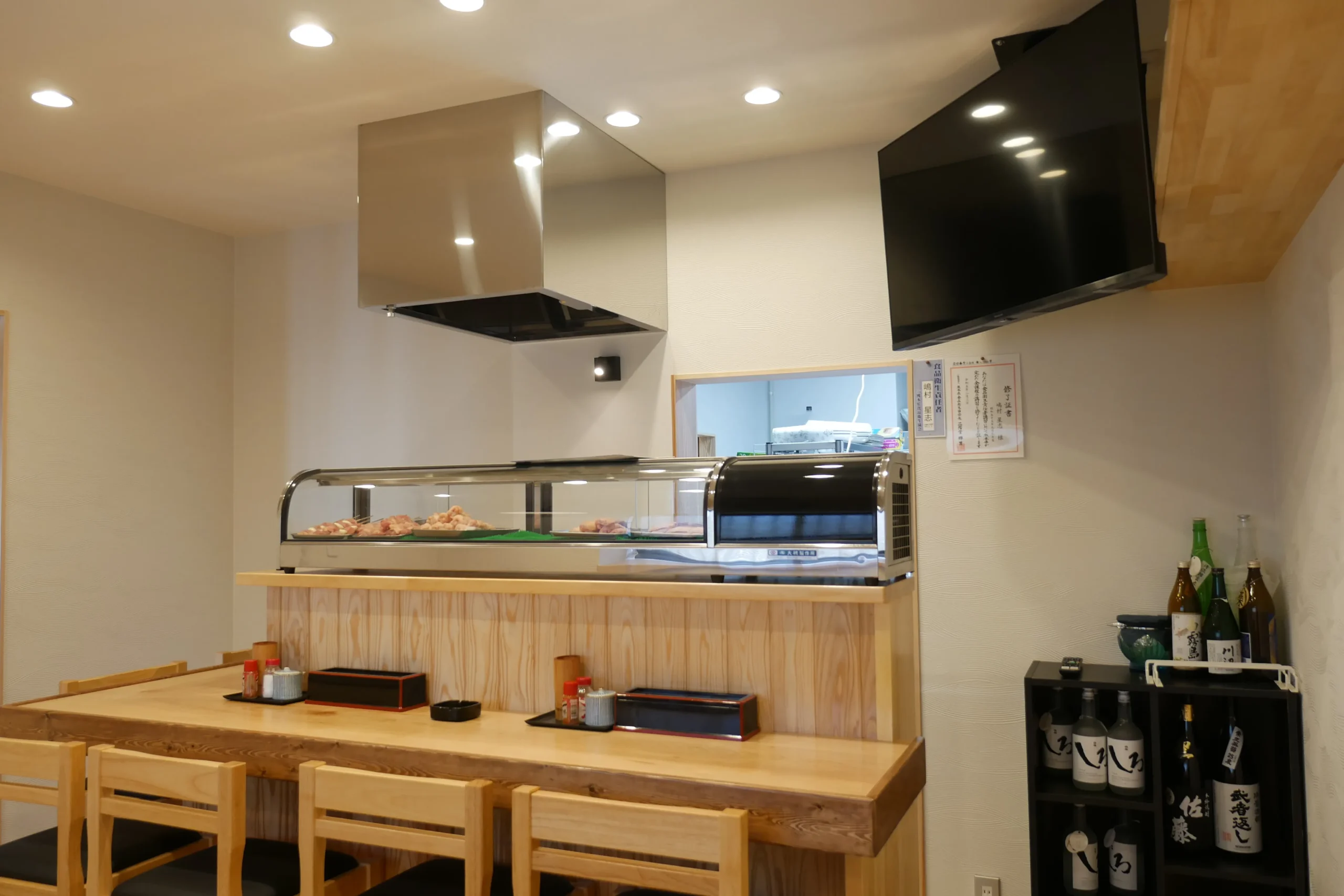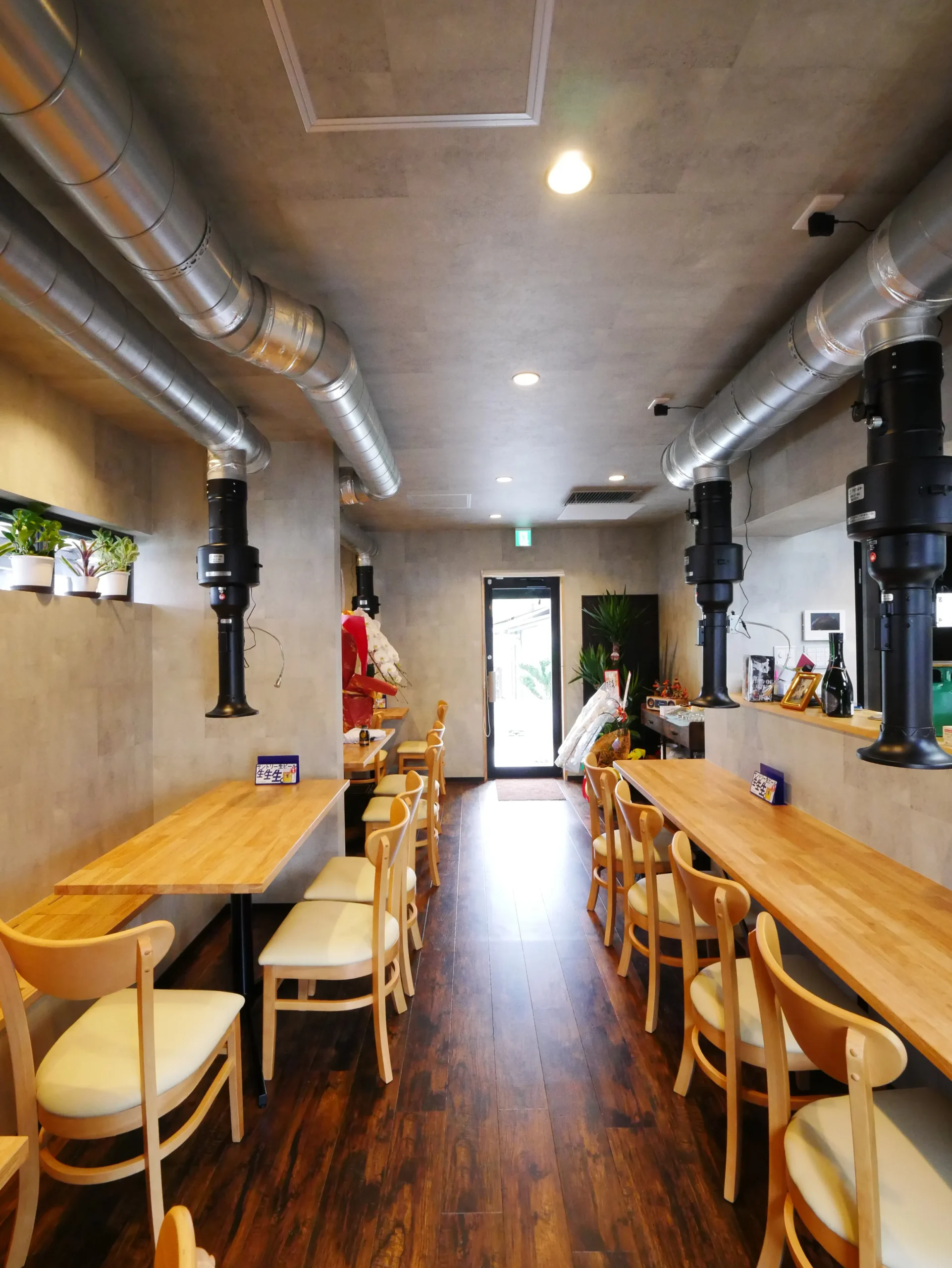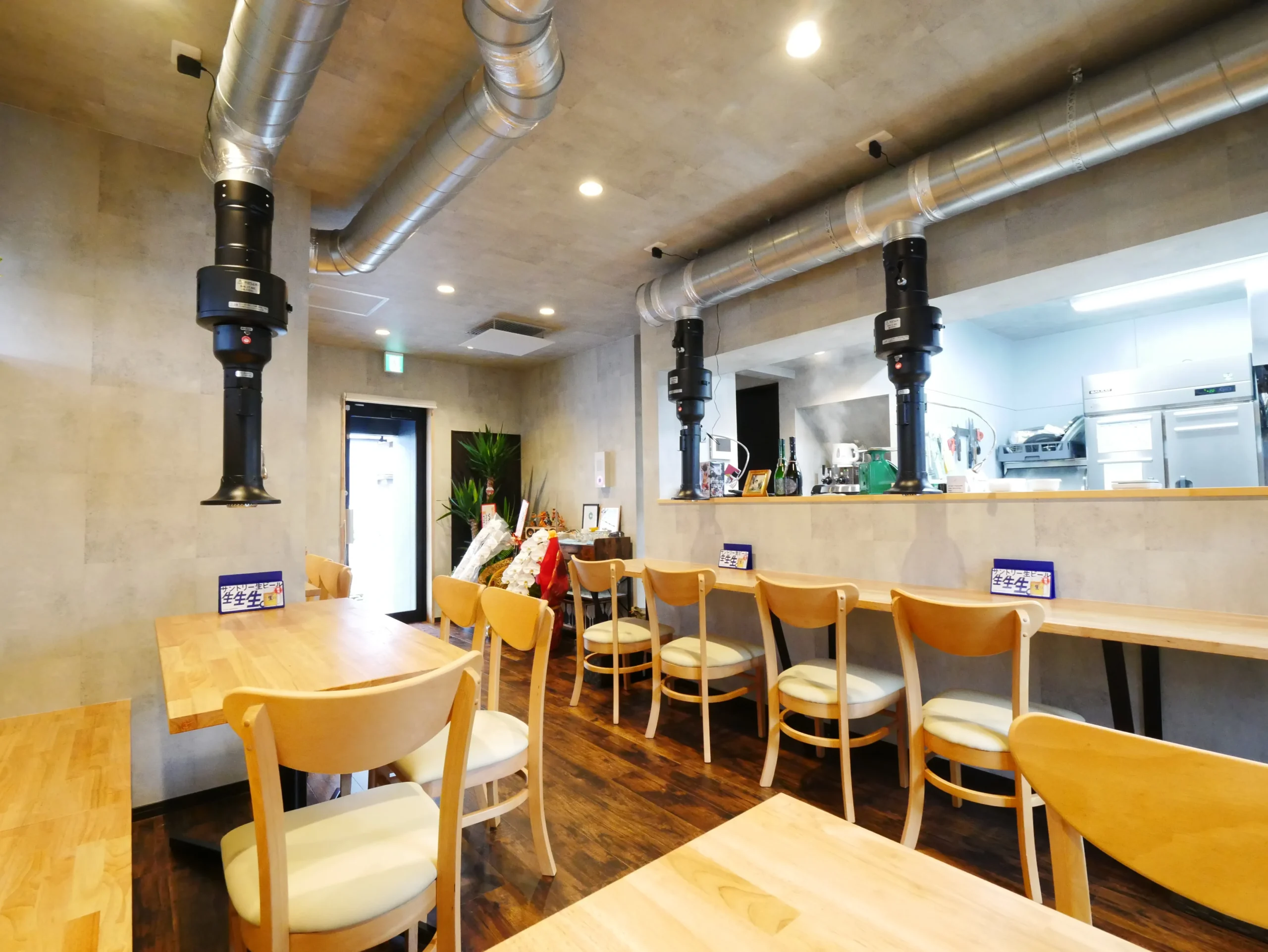昭和に建てられたお家をインナースケルトンリフォームで、焼肉店舗付きの住まいへ。1階の6畳2間の和室は仕切りの壁を撤去して、焼肉店舗(飲食ブース&厨房ブース)へフルリノベーション。限られた空間の中で店舗スペースと住宅スペースをしっかり分けるために、玄関やトイレを別々に設置しました。