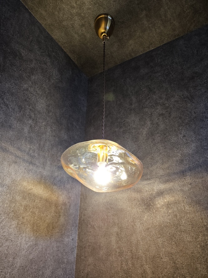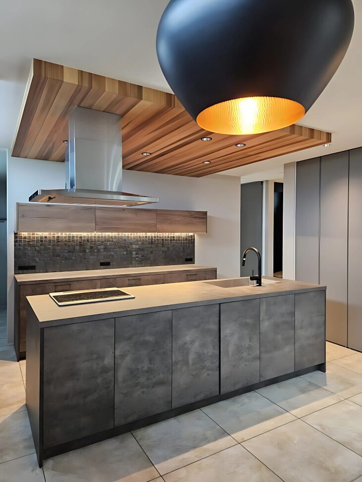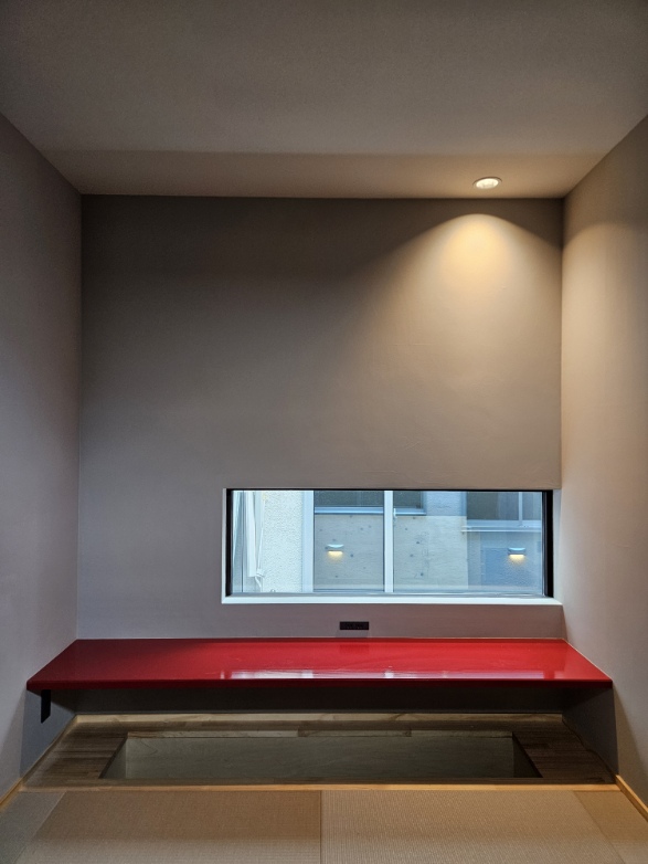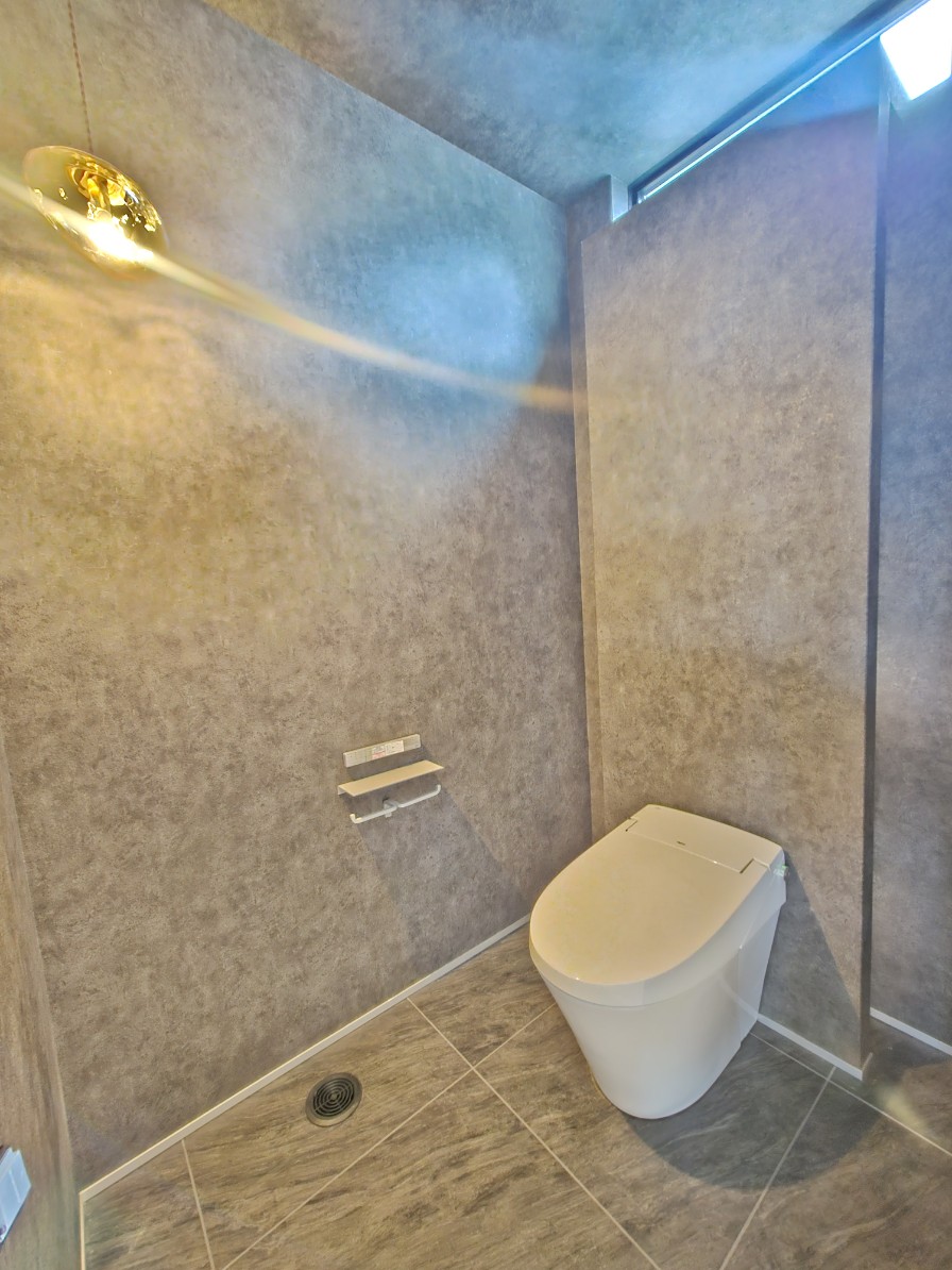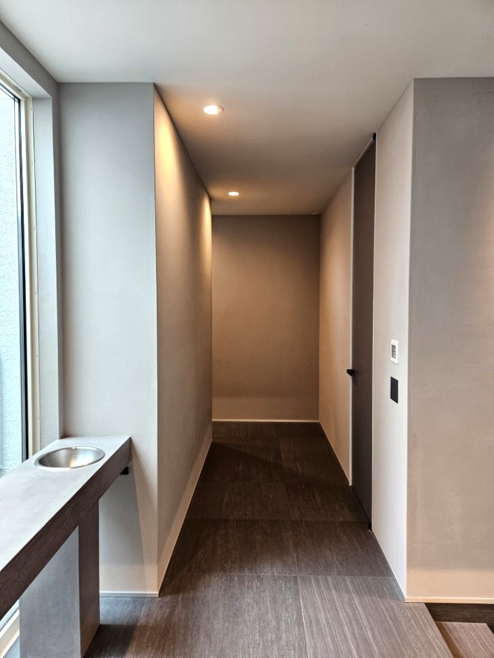 間接照明の柔らかな光が、グレー基調の空間に優しく広がり、上品なタイル張りの床が空間全体を格調高く演出します。